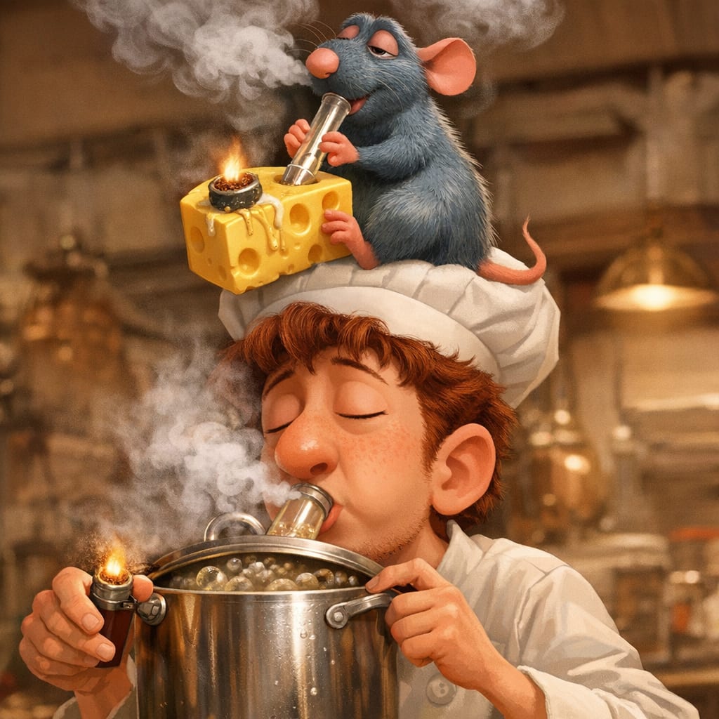 @zippyus Here’s the image you requested for “ratatouille on chef s head enjoying cheese bong. chef enjoying stockpot bong. animated movie.”
