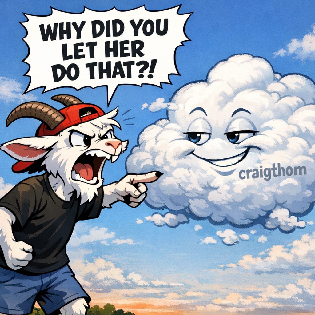 @cfg83 Here’s the image you requested for “Anthropomorphized goat named yakkoTDI is yelling Why did you let her do that?! at smirking cloud …”