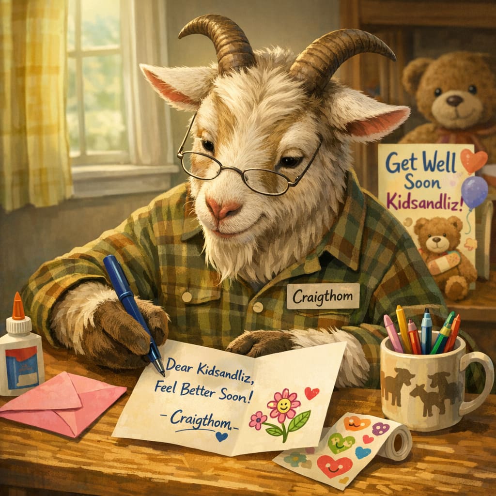 @cfg83 Here’s the image you requested for “Anthropomorphized goat named craigthom is filling out get well card to Kidsandliz.”