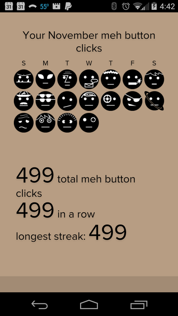 Shame that for me I'm not allowed to (for religious reasons) access my phone in order to press Meh. Every couple of months, the streak reverts back to 0. What good is restraint on placing orders on a daily basis if it's for naught? Sigh...