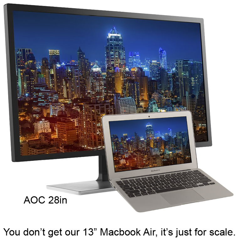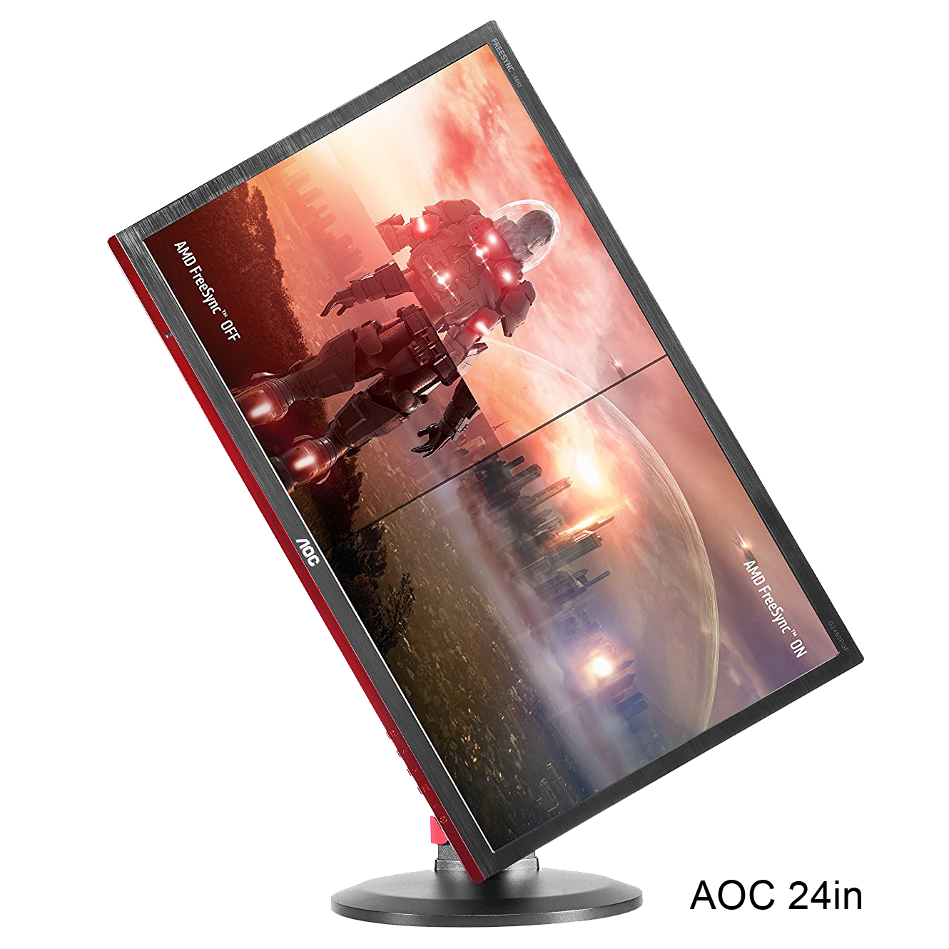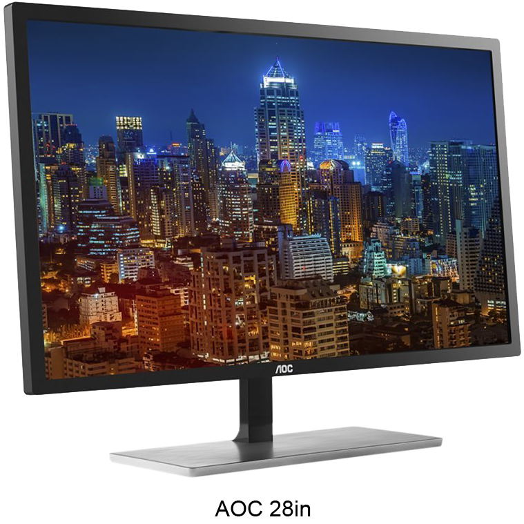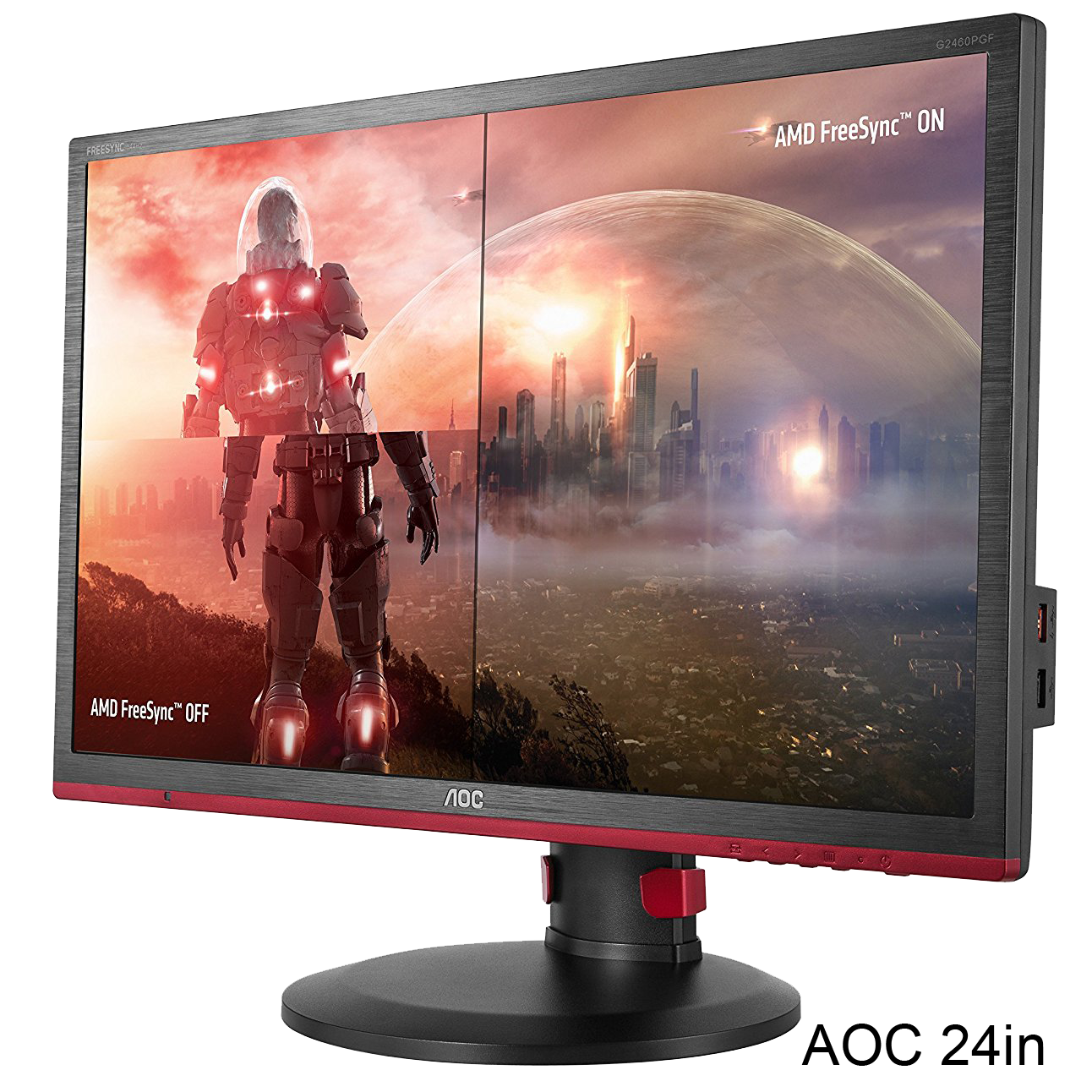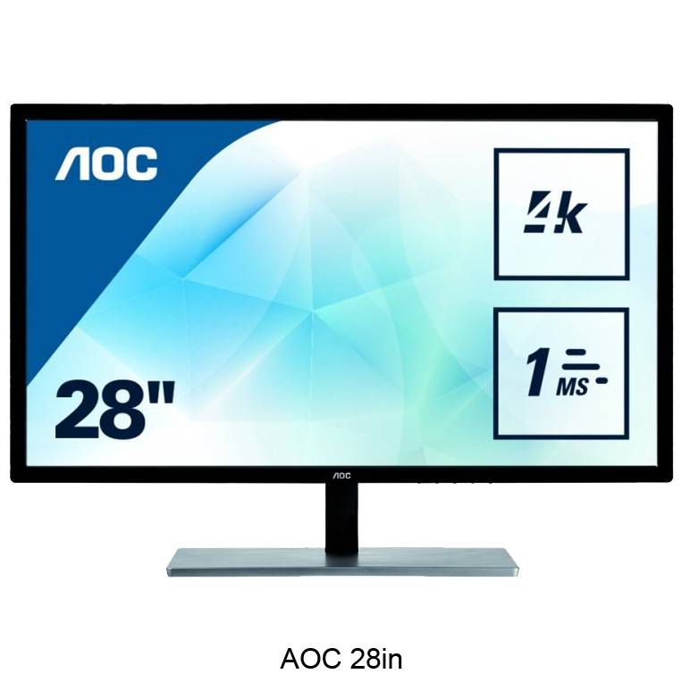 Specs ====### 24 inch:- Model: G2460PF- Condition: Refurbished- Brand: AOC- Cabinet Color: Black- Display - Screen Size: 24" - LED Backlight: Yes - Widescreen: Yes - Recommended Resolution: 1920 x 1080 - Refresh Rate: 144 Hz - Viewing Angle: 170 (H) / 160 (V) - Pixel Pitch: 0.27675mm - Display Colors: 16.7 Million - Brightness: 350 cd/m2 - Contrast Ratio: 80,000,000:1 - Response Time: 1ms - Panel: TN - Adaptive Sync Technology: FreeSync (AMD Adaptive Sync)- Connectivity - Input Video Compatibility: Analog RGB, Digital - Connectors: D-Sub, HDMI, DisplayPort - D-Sub: 1 - HDMI: 1 - DisplayPort: 1 - USB 2.0: 2 - USB 3.0: 2- Power - Power Consumption: Typical: 8W - Standby: 1W- Convenience - Regulatory Approvals: cTUVus, CE, FCC, RoHS, Energy Star, Windows 8 - Stand Adjustments: Pivot: Yes - Swivel: -165/165 - Tilt: -5/+22 - Height Adjustment: 130mm - Built-in Speakers: 2 x 2W - HDCP Support: Yes - VESA Compatibility - Mountable: 100 x 100mm- Dimensions - Dimensions (H x W x D): 15.50" x 22.26" x 9.63"### 28 inch:- Model: U2879VF-B- Condition: Refurbished- Display - Model: U2879VF-B - Condition: Refurbished - Monitor Size: 28 Inch - Visible screen size: 620.93 x 341.28 mm - Screen format: 16:9 - Brightness: 300 cd/m - Contrast ratio: 1000:1 - Dynamic contrast ratio: 80M:1 - Viewing angle: 170/160 - Response time: 1 ms - Panel type: TN - Refresh rate: 60Hz - Resolution: 3840x2160 PX - Pixel pitch: 0.16 - Colors: 1.07 Billion - EAN: 4038986185714 - Backlight: WLED - FlickerFree: Yes - Bezel type: Normal - FreeSync: Yes- Connectivity: - DVI: Yes - HDCP compatible: Yes - Display Port Input: 1 - Display Port version: 1.2 - MHL: Yes - HDMI (2.0, MHL): 1 - HDMI Version: 2 - VGA: Yes- Audio - Speaker power: Watt - Audio output: Yes- Power - Power Source: 100 - 240V 50/60Hz - Power supply: Internal- Dimensions - 18.44 x 25.95 x 6.03 inchesWhat’s in the Box? ====1x MonitorPictures====Monitors24in24in back24in side24in Tilted24in ScreenScale28in28in back28in side28in ScreenScalePrice Comparison ====24in: $198 at Amazon28in: $318.99 (new) at Amazon