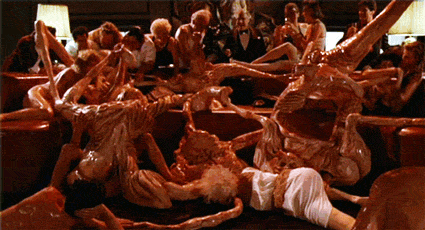 Here’s a lovely review about the society movie with extra photos. My favorite is the hand coming out of the mouth, or the head coming out of the butt, lol