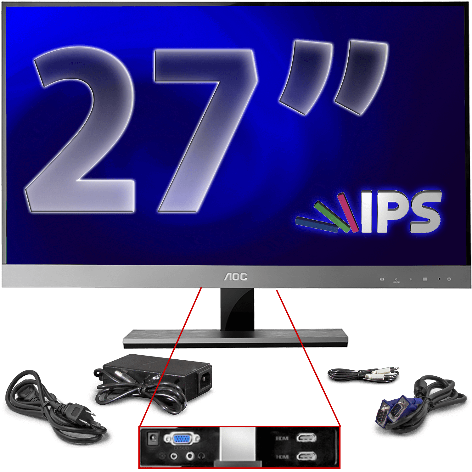 Specs====- Model: I2757FH-B- Ultra-thin LED IPS Monitor (10.6mm thin) - Multiple I/O Ports (2 HDMI) - Viewable Image Size: 27 - 16:9 Aspect Ratio - WLED Backlight - Brightness: 250cd/m2 - 50,000,000:1 DCR - 5ms Response Time - Two built-in speakers - Screen+ Technology - e-Saver Feature for low power consumption - 16 OSD languages including English, Spanish, French and more - iF Design Award winner - Manufacturer specsCondition - Refurbished Warranty - 90 Days AOCShipping: $5 or free with VMPEstimated Delivery: 2/5 - 2/9What’s in the Box?====1x Monitor 1x Stand 1x Manual and CD 1x Power Adapter 1x VGA Cable 1x Audio Cable Pictures====MonitorIncluded with itSide viewBackGggggllllleeeeennnnPrice Check====$324.99 at Amazon (new)