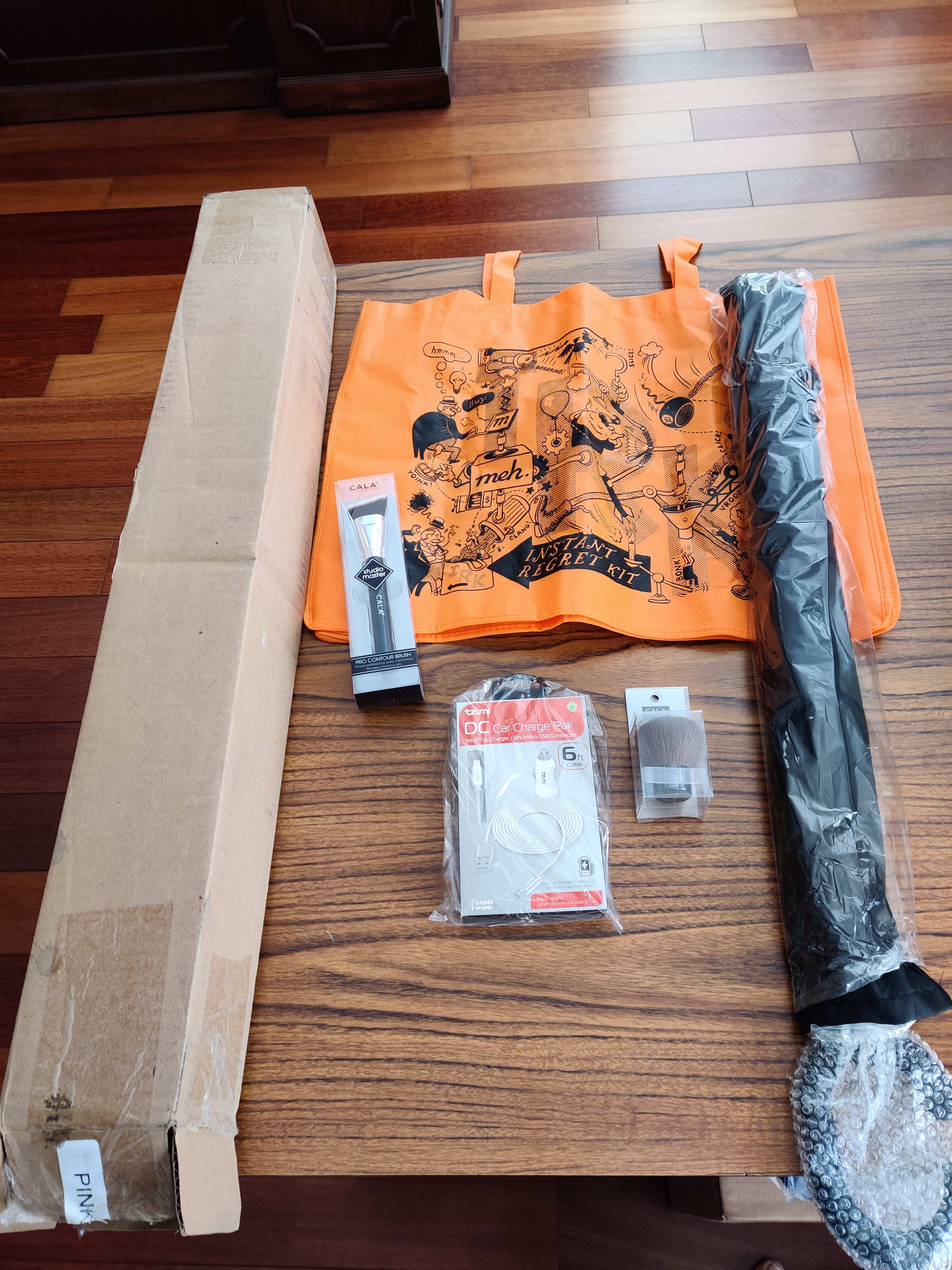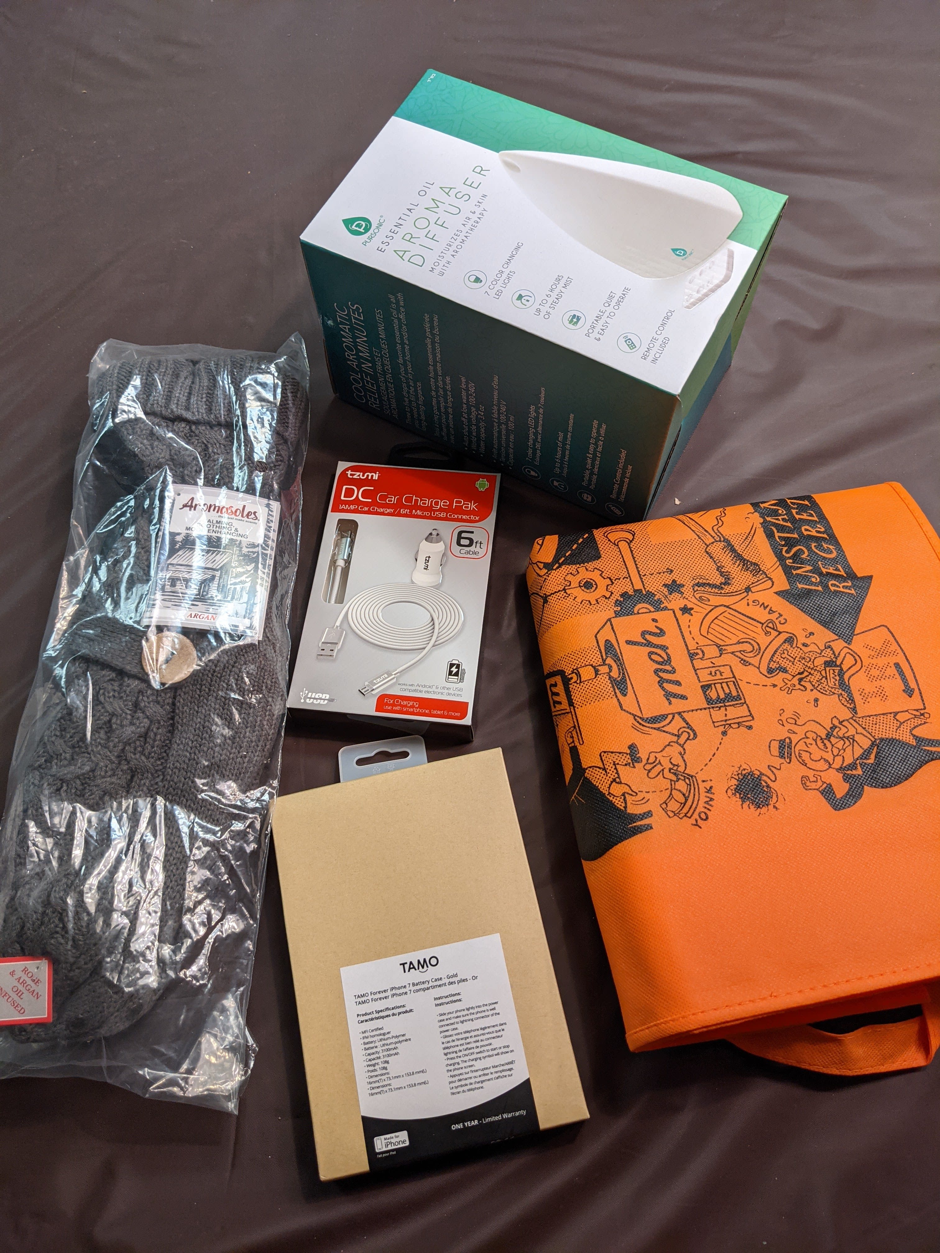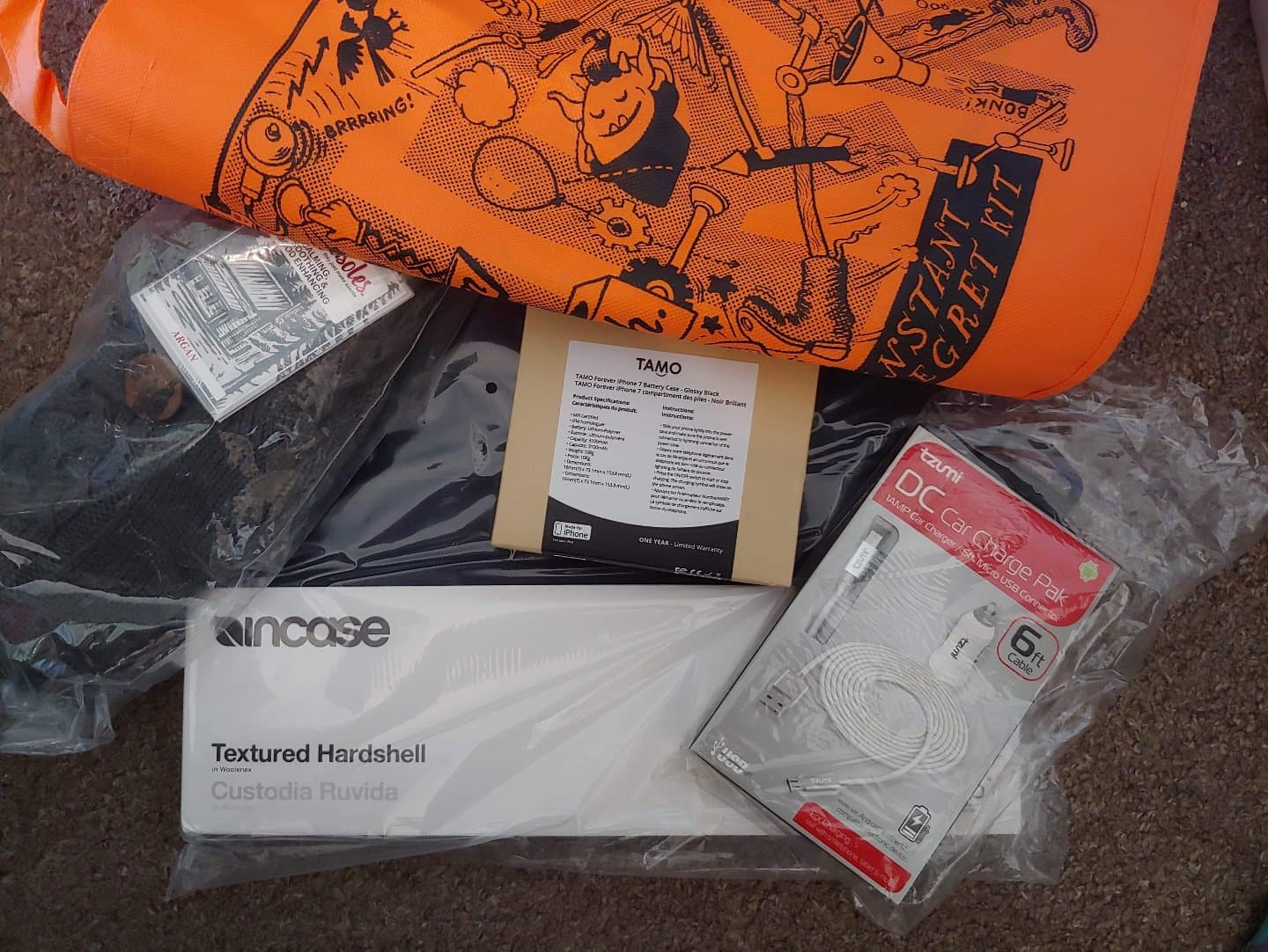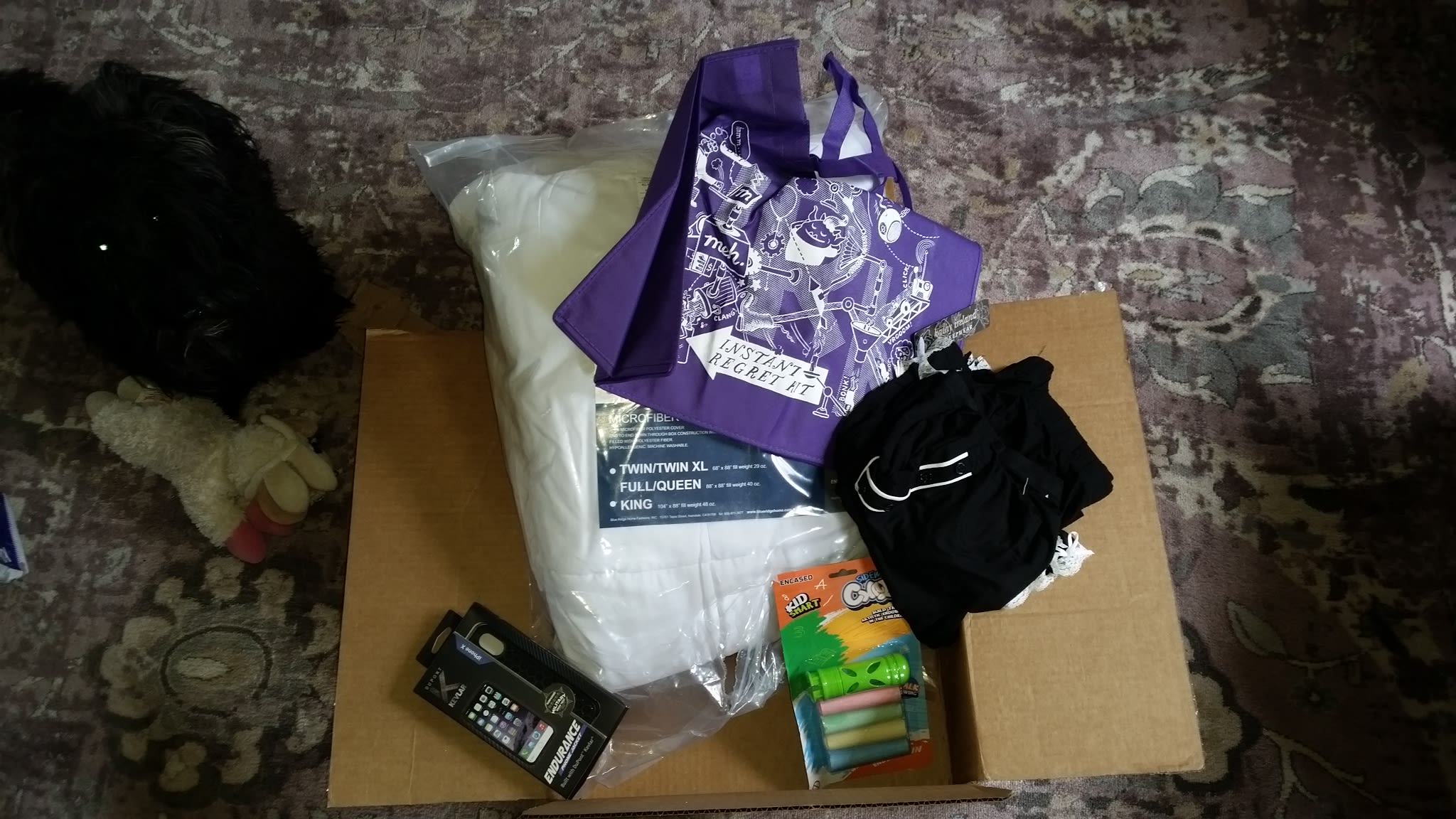 From what I remember, I got the chair cover, wall charger, mac book pro cover, the tracker, and an orange irk bag. I like the bag and the charger is useful, but everything else really does live up to the name of instant regret. I’ll probably toss most of it except the bag and charger, which seems like a polluting waste. Not sure I’m going to buy an irk again if I can even do so, because if I’m not gonna be able to use most of it than I might as well leave them for someone who can.