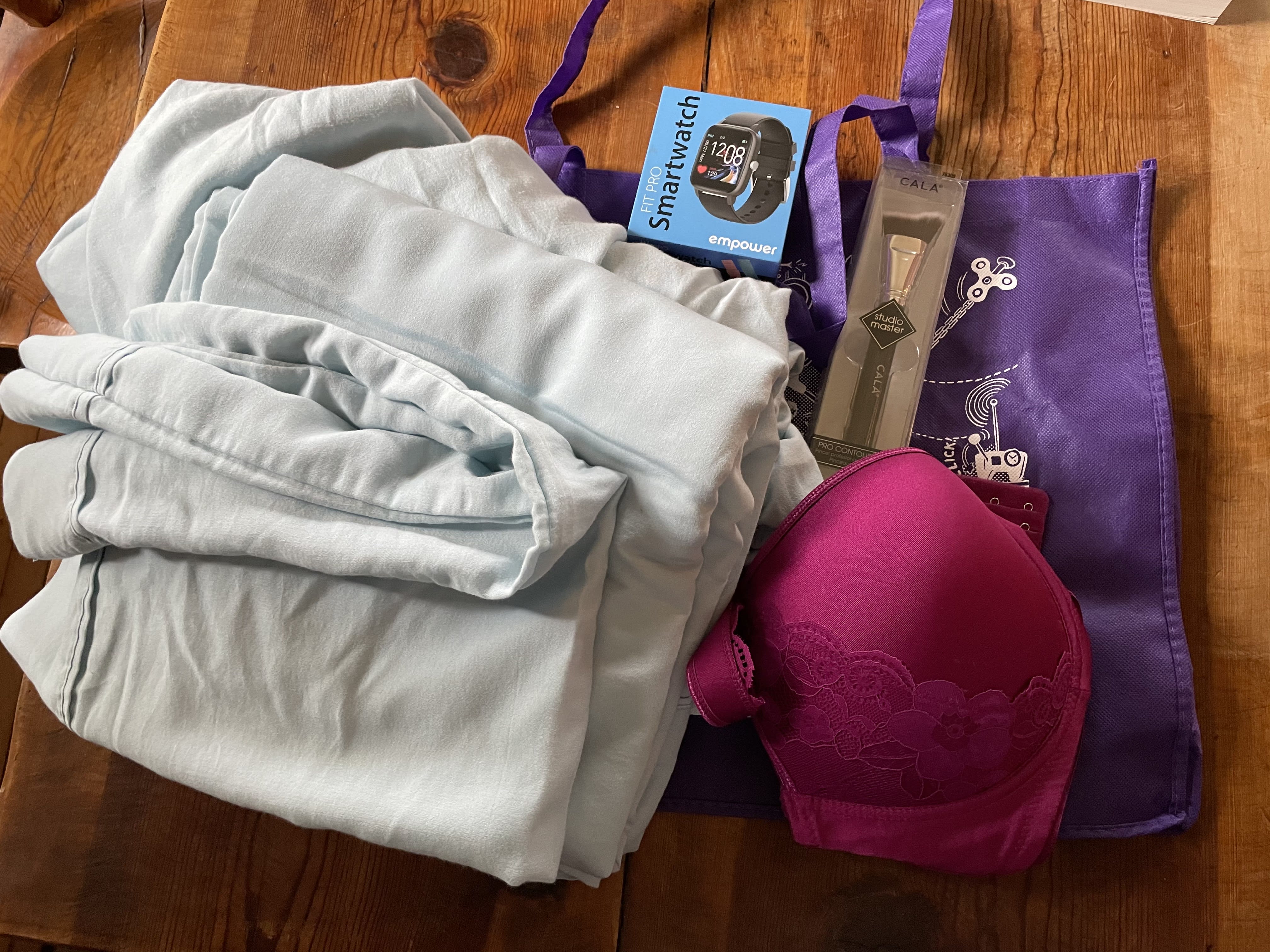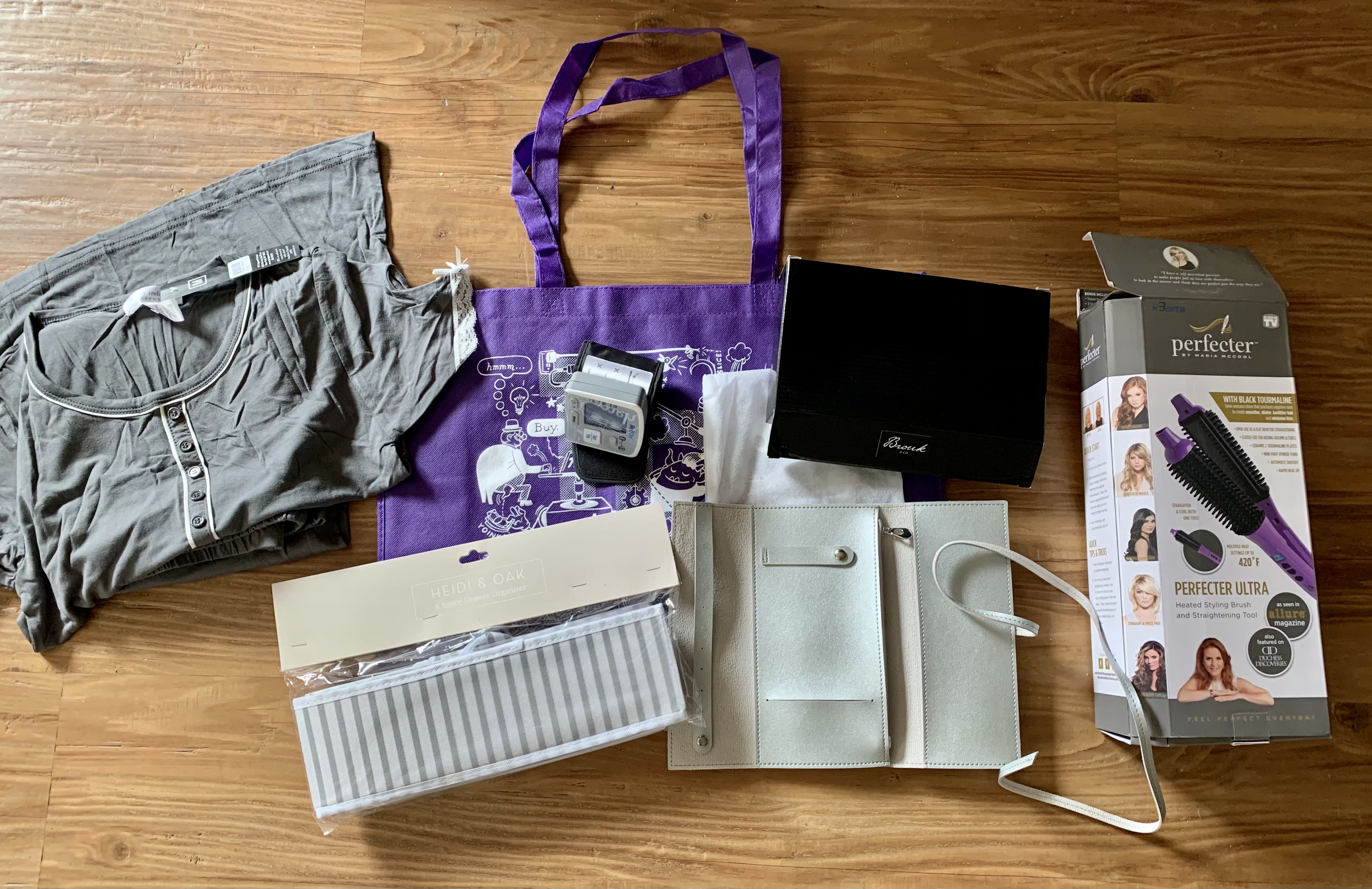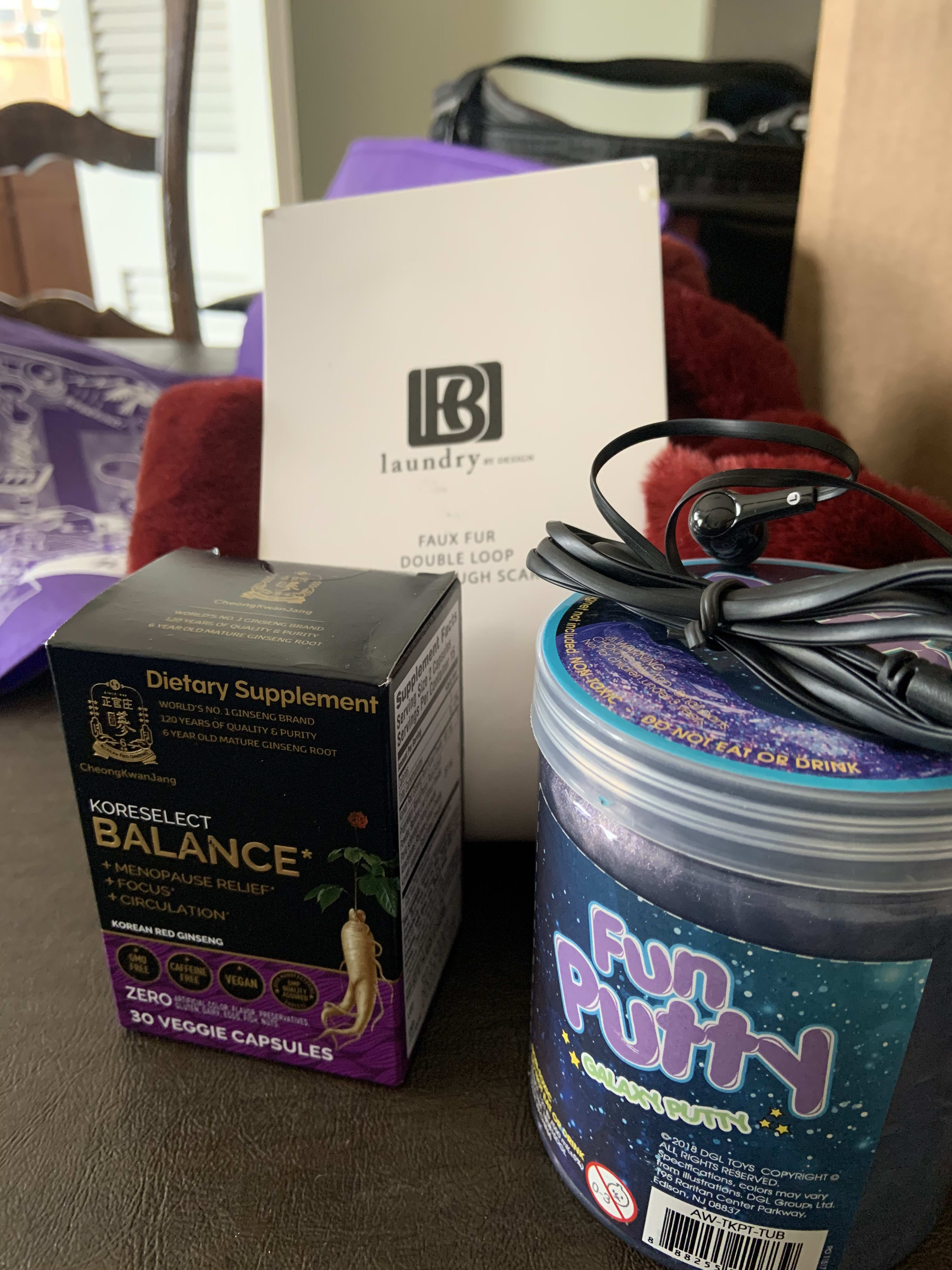 A wallet/clutch with a built-in powerbank, a jar of body scrub, a purse hanger keychain, a “Shawl Dawl”, and (gasp) a SECOND purple bag!