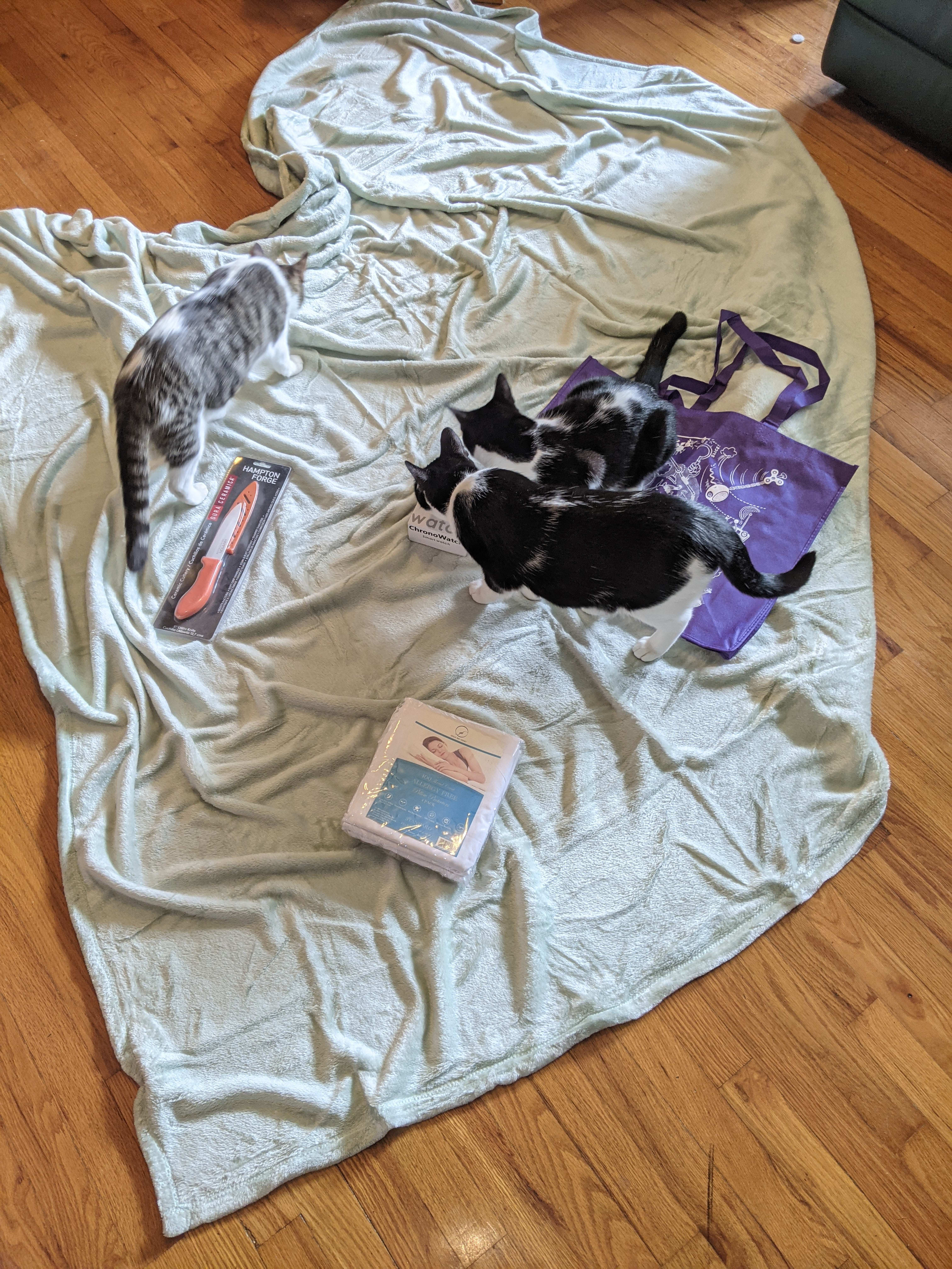Irk bag/cat mat, make-up brush/cat toy, KN95 face masks, pale chair cover that I’ll probably give away, and a very nice set of Pfaltzgraff knives/forks/spoons etc! (Yes, I know they’re called “flatware” but I’m irritated by the way everything is called “something-ware” nowadays. “Serveware”, “glassware”, “tableware”, “cookware”, etcetcetc.)