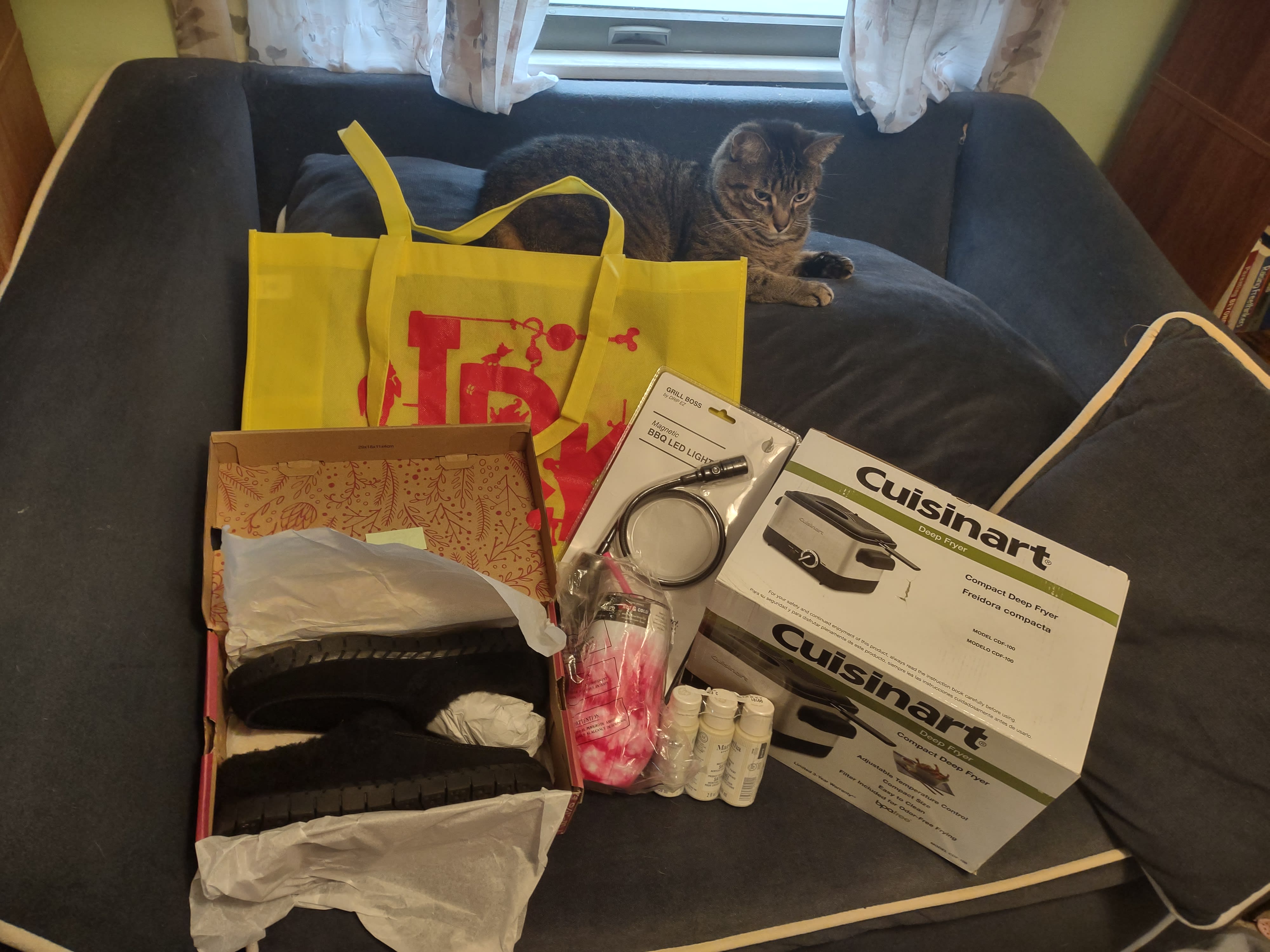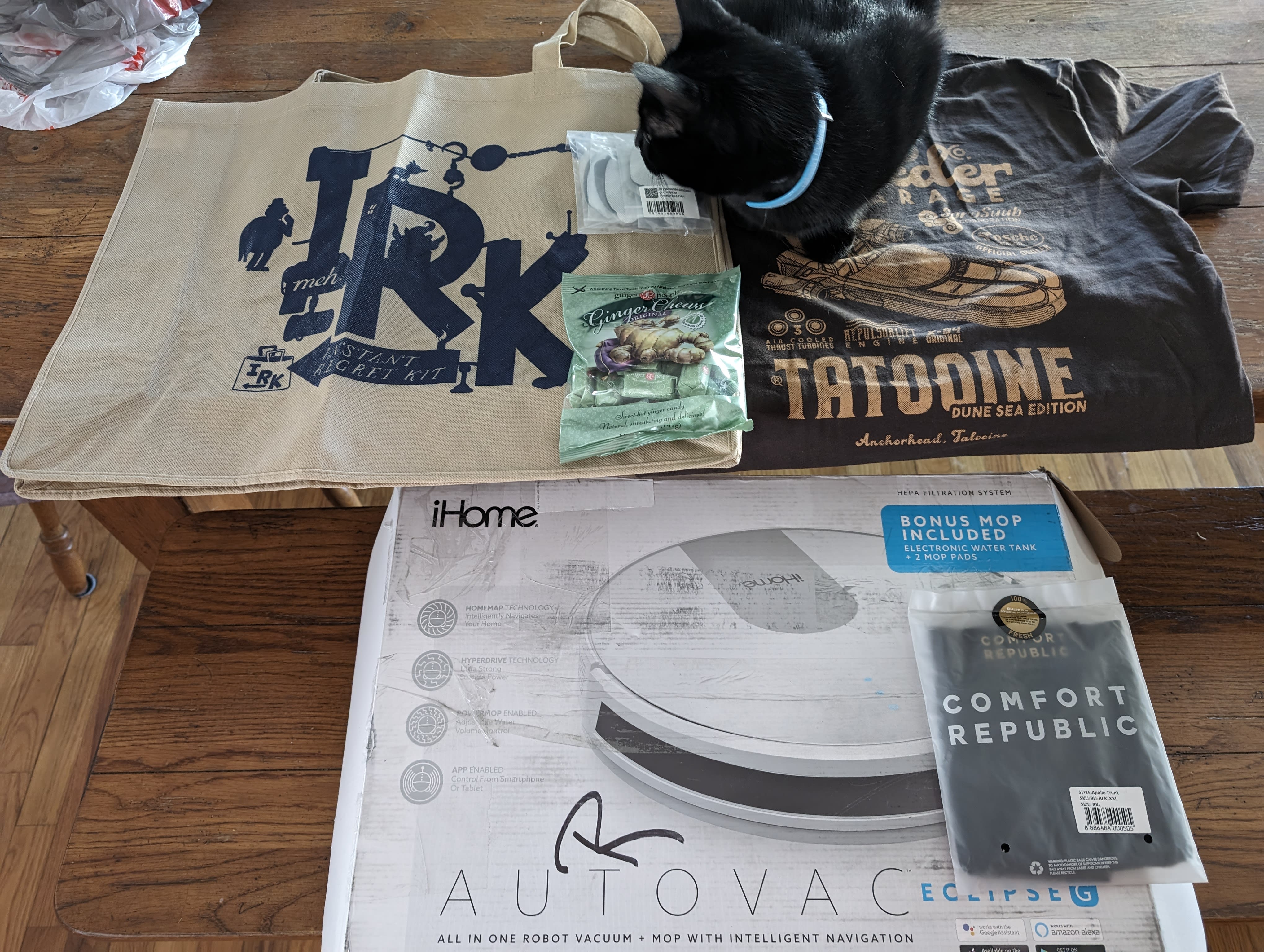 I see a giant box labeled “robot vacuum” next to stuff from the murder mystery mehrathon.