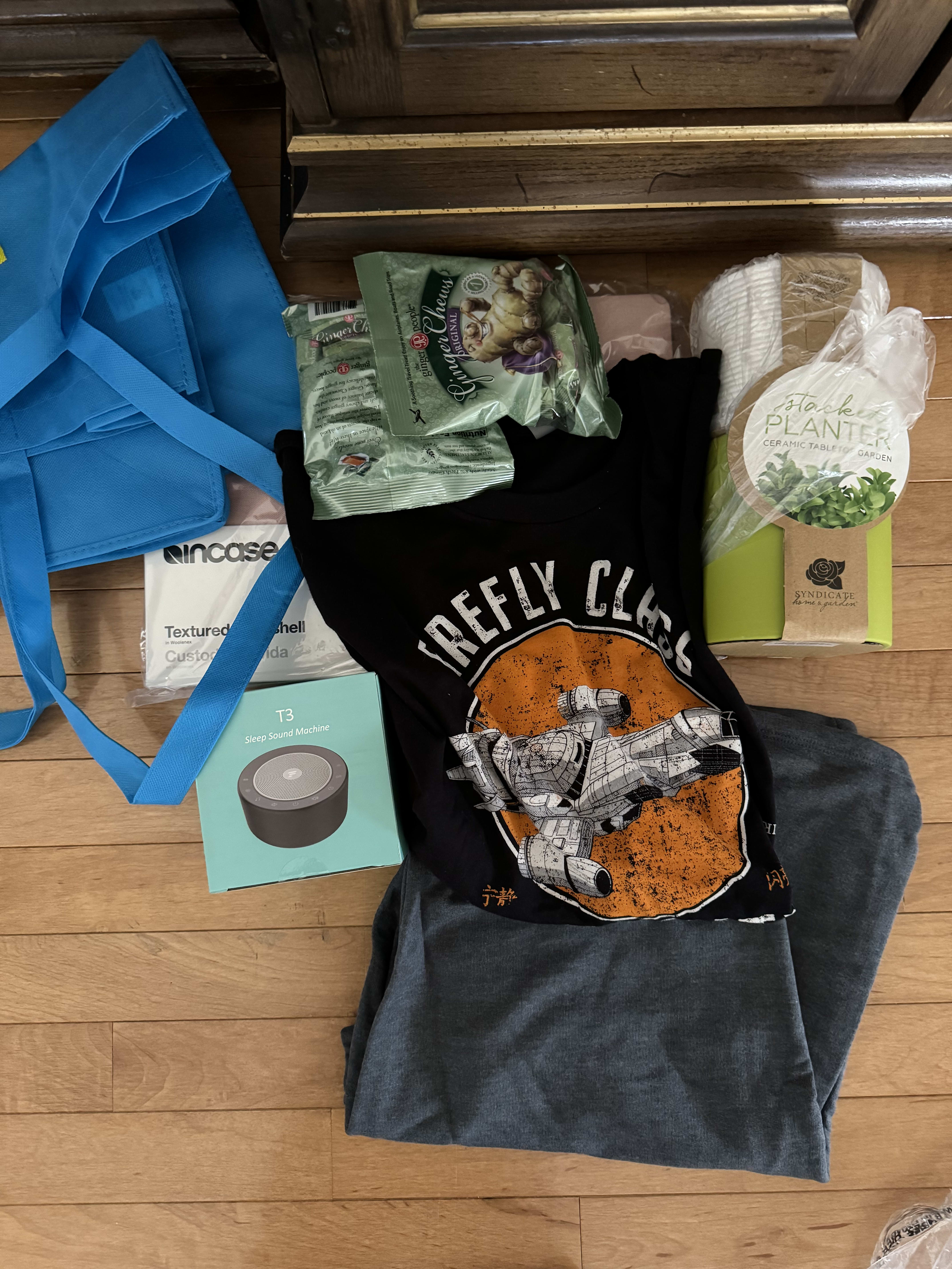 Not a great haul for me. A white IRK bag, 2 bags of ginger chews( where is the expire date?) a mac case (I don’t have a Mac), white queen sheet sets, glitter paint, box of expired pumpkin spice bites and a small women’s top. I should stop buying these things