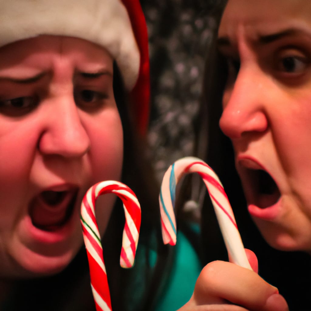 /showme one person really enjoying a candy cane with another person who hates candy canes