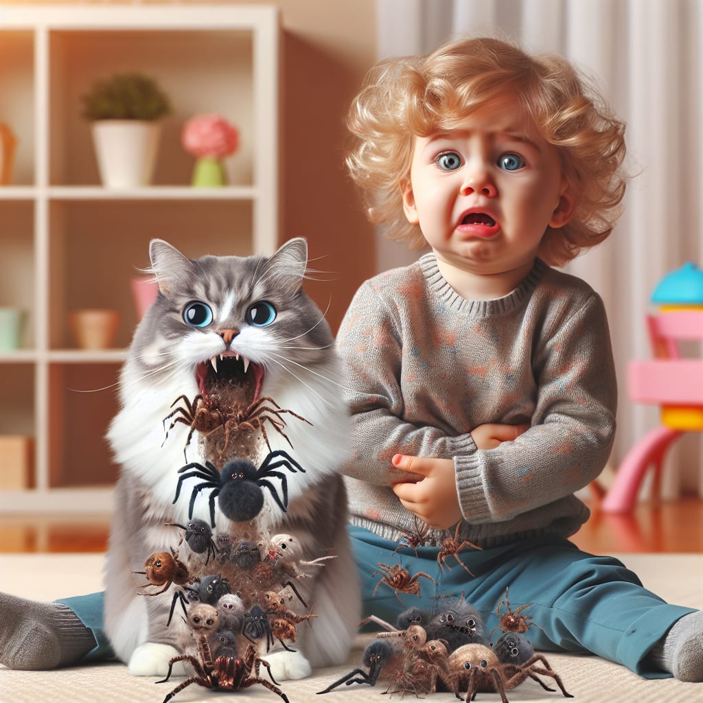 /showme a toddler squeezing a cat which is vomiting horrific spiders