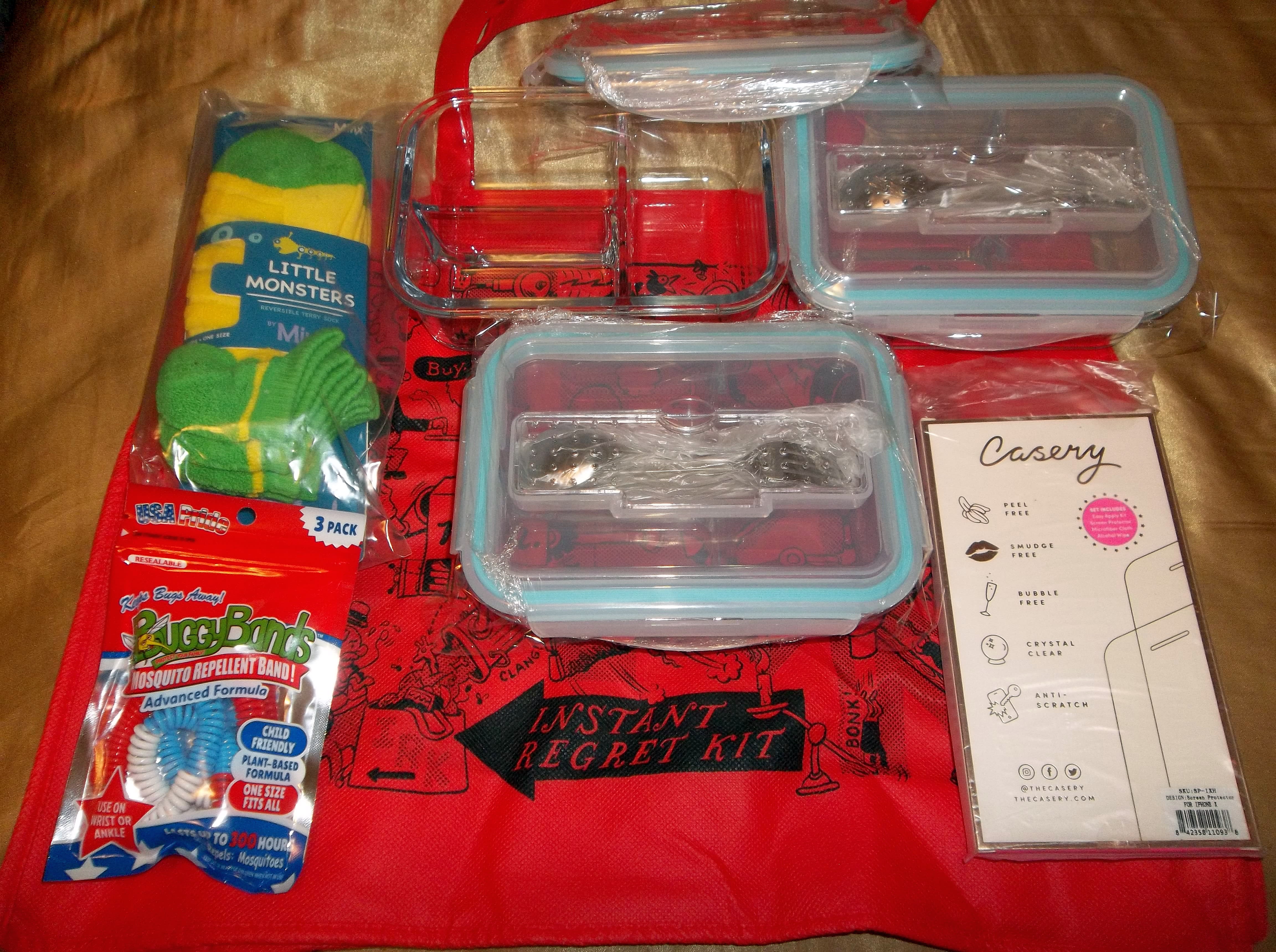 Some crafting stuff, a 36C pink bra, some size 6 ladies fuzzy slippers, iPhone screen protectors, and a red IRK bag. Pretty Regrettable To Me-- That said, the lady delivering fresh eggs this morning might use some of those things. Maybe I can barter for eggs!
