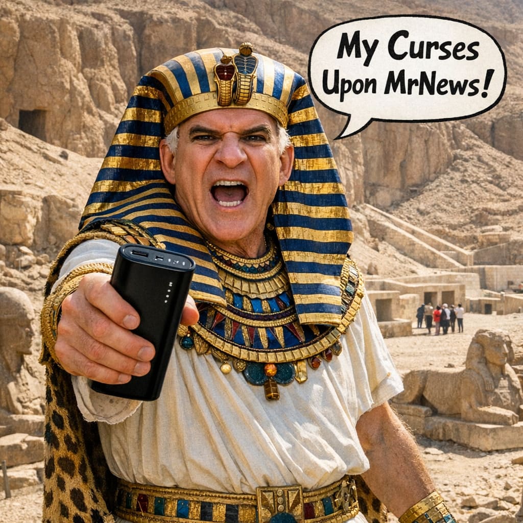 /showme steve martin as king tut holding a usb power bank in egypt’s valley of the kings saying “My Curses Upon MrNews!”