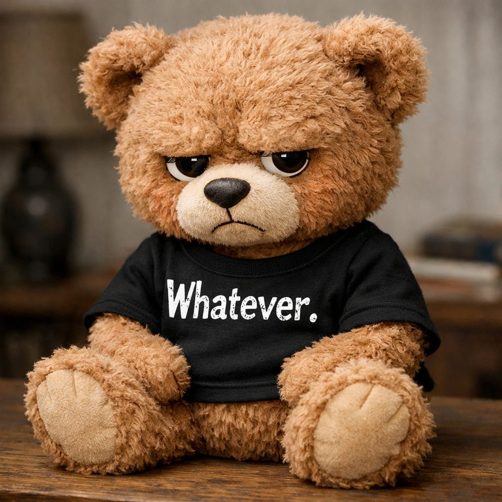 @cfg83 Here’s the image you requested for “Teddy bear in sullen mood with T-shirt that says Whatever.”