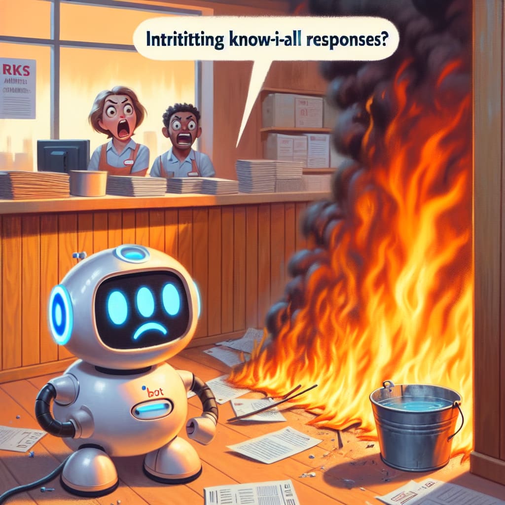 /showme a well-intentioned but mediocre AI bot trying to extinguish a fire ignited by an irate customer who was not happy about bad IRKs.