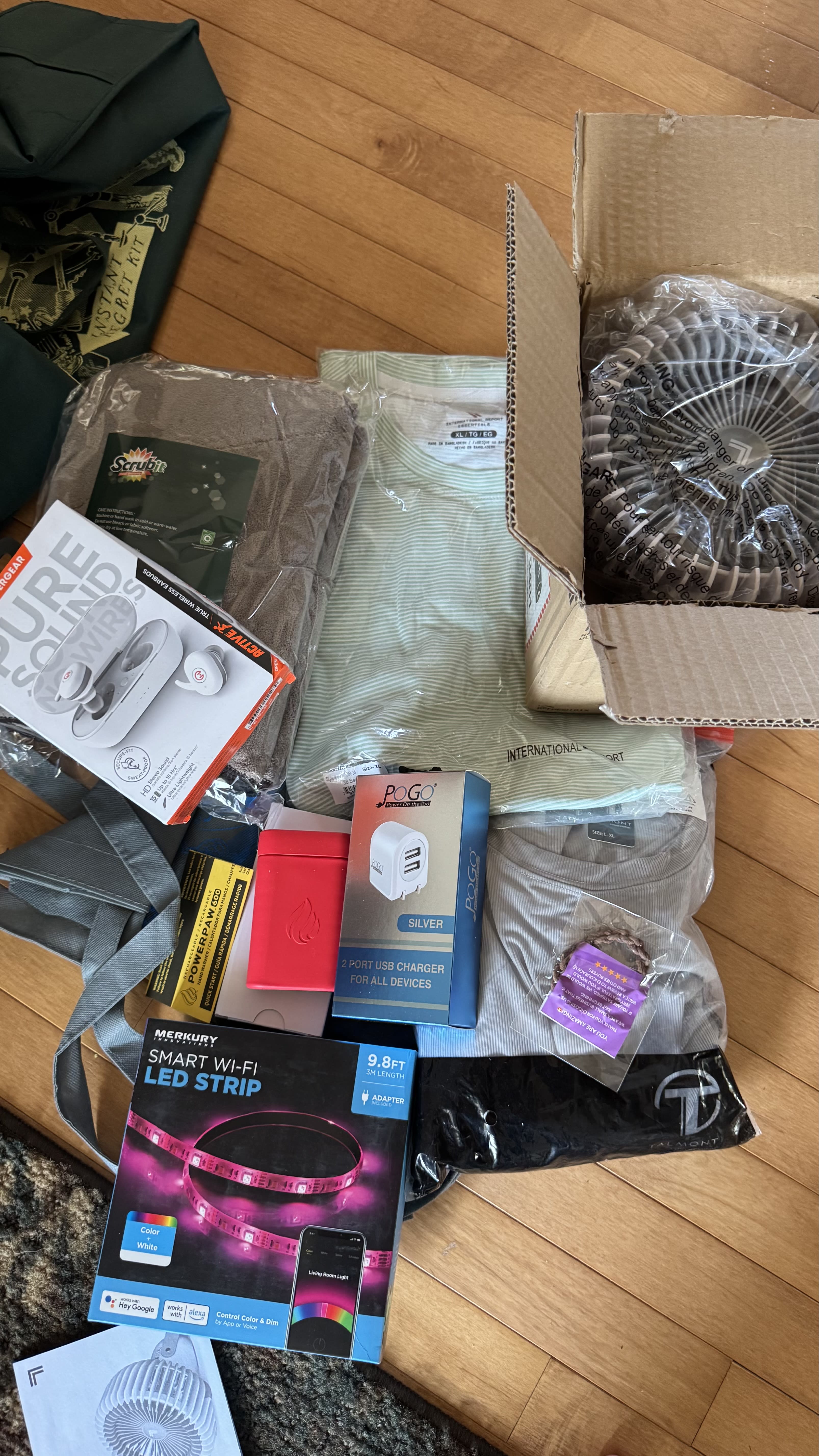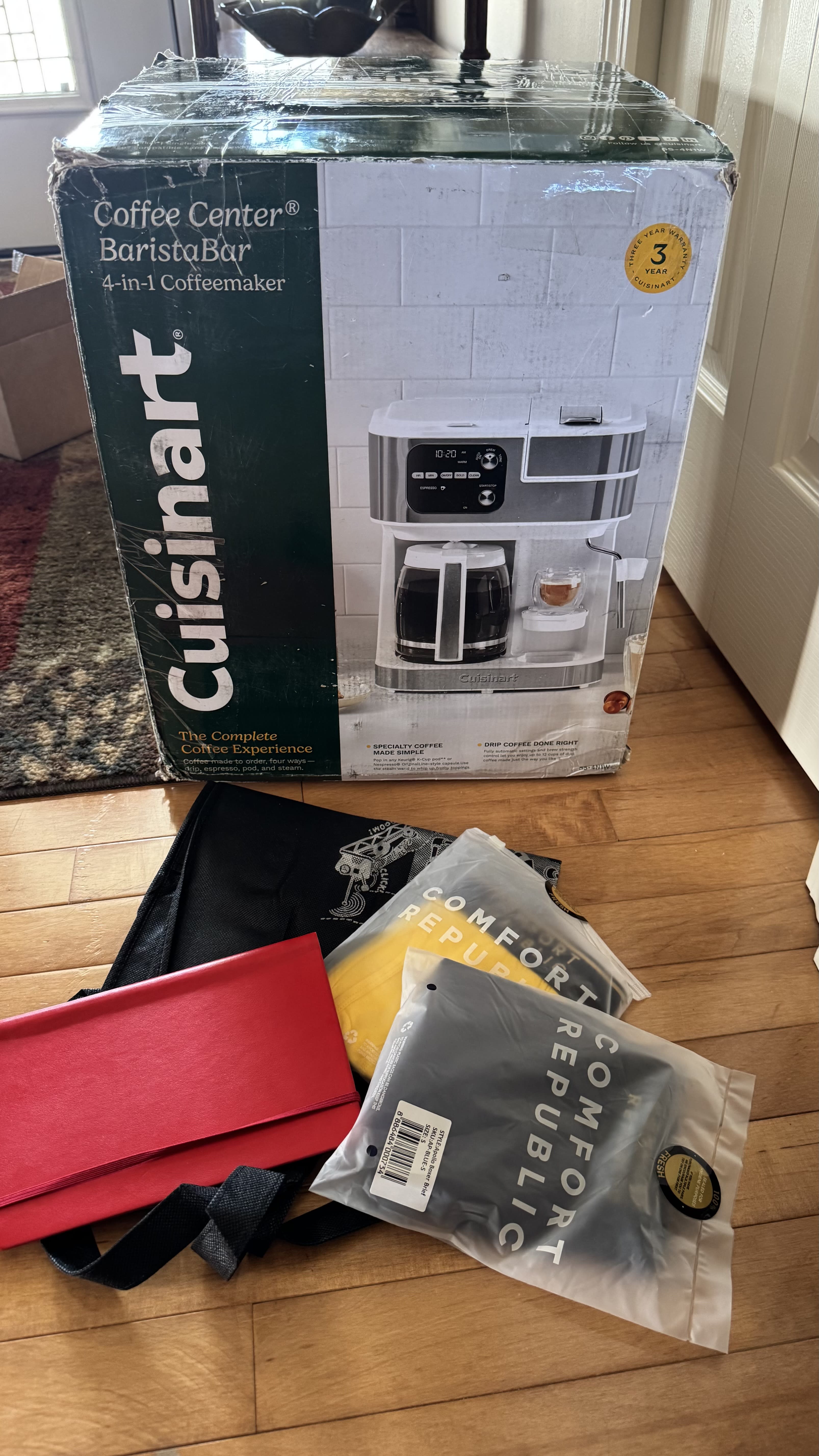 Cuisinart stand mixer, box and packaging totally destroyed, but all the pieces were there and still in original plastic bags and it works. I don’t need a stand mixer since I have a kitchenaid in storage, but this has a slightly smaller profile so may get used.