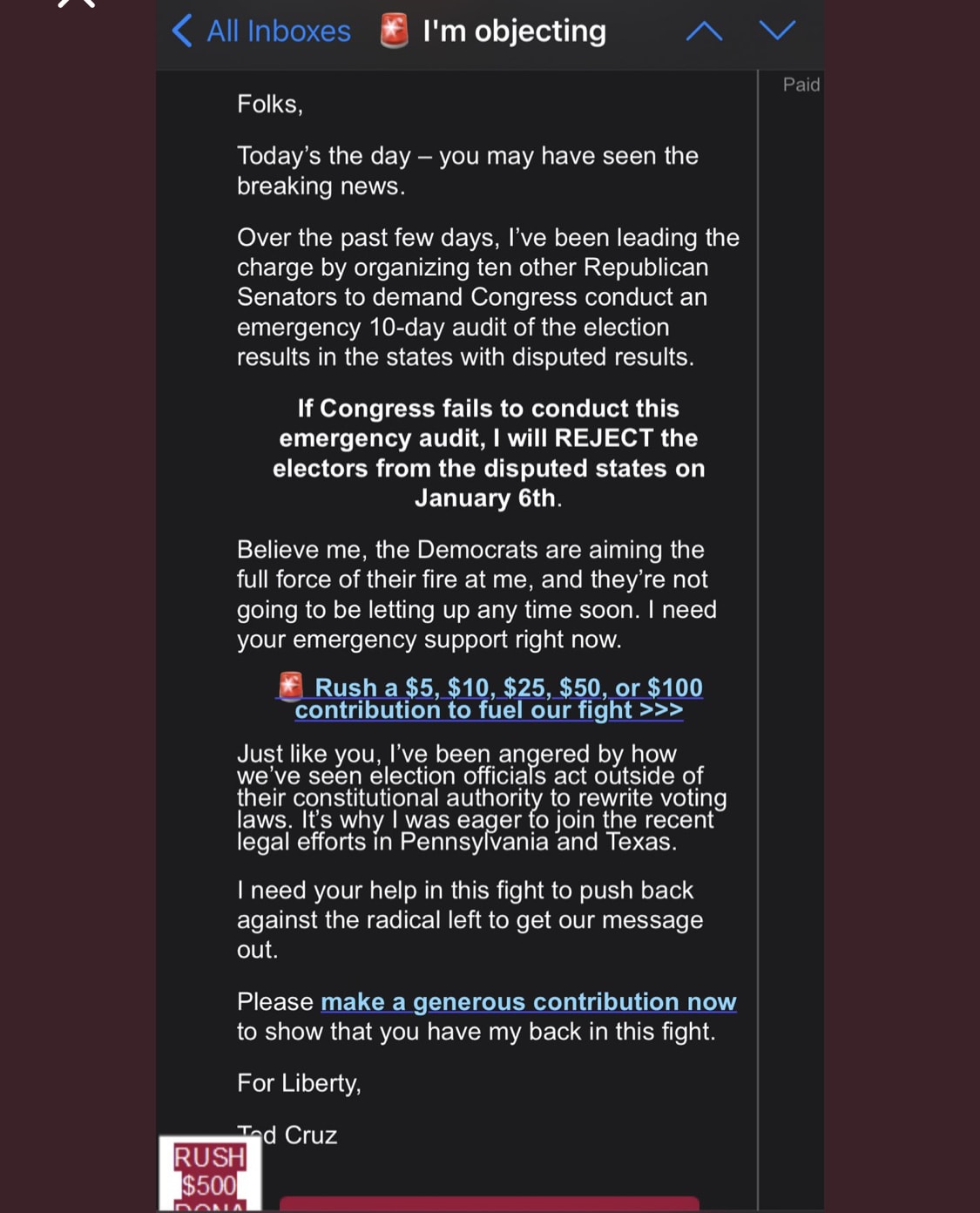 Ted Cruz announces objection to Arizona count. Someone says “Ted Cruz: your objection to the electoral count in Texas is registered.”