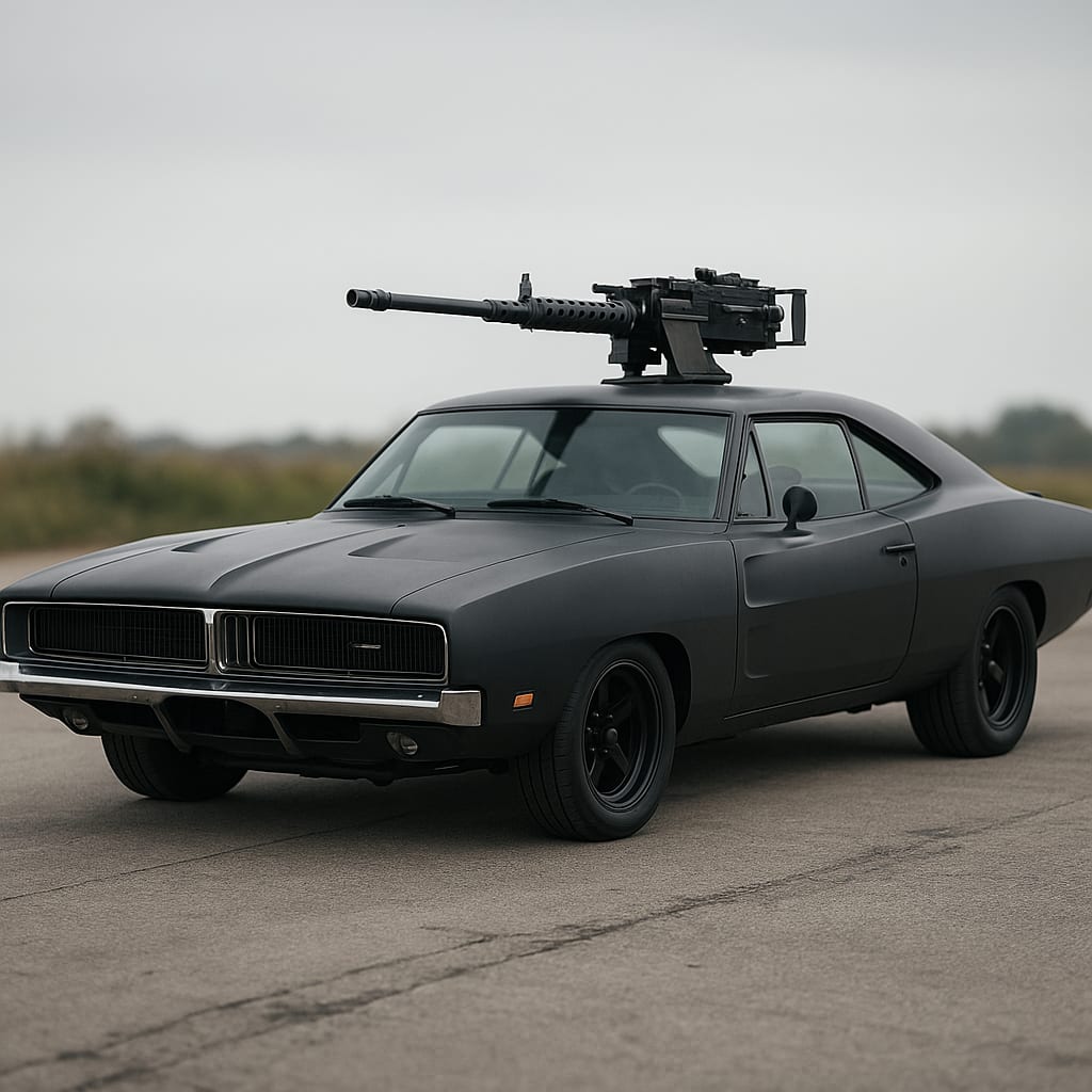 @rockblossom /showme a Dodge Charger with a machine gun on its roof