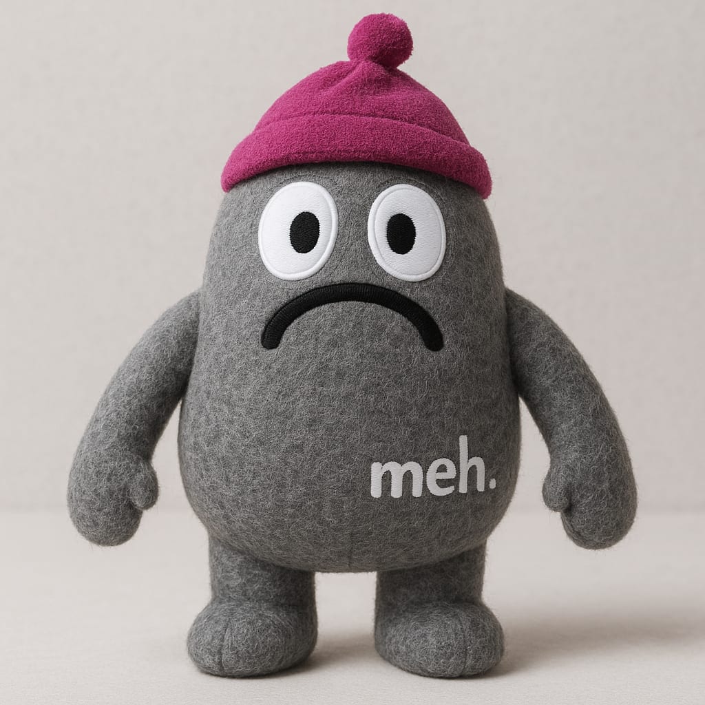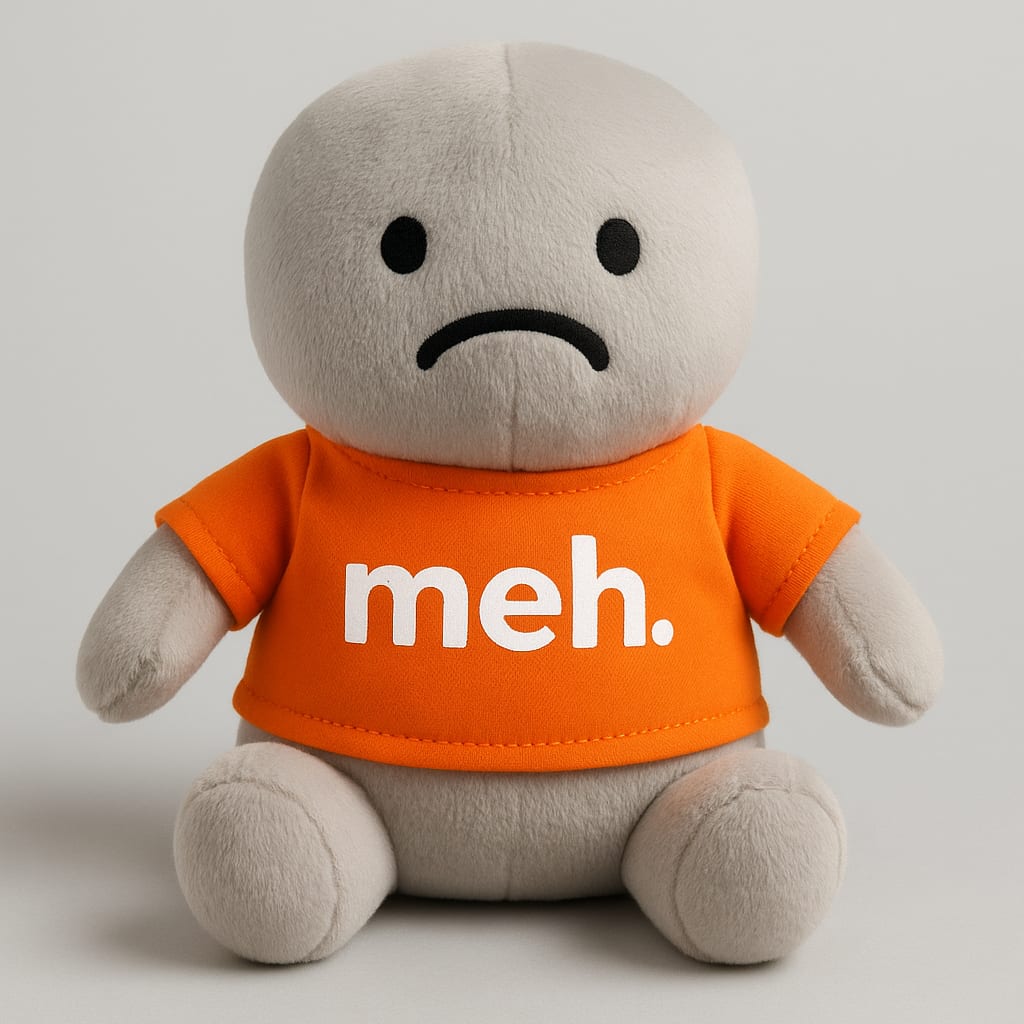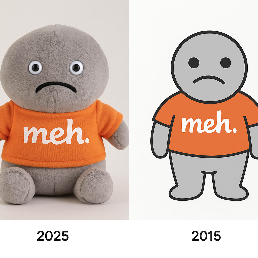 /showme compare an image of the 2025 stuffed mascot plush found from meh.com (it is wearing an orange shirt) to the less stylized but no more unrealistic 2015 vector graphic of the meh.com mascot
