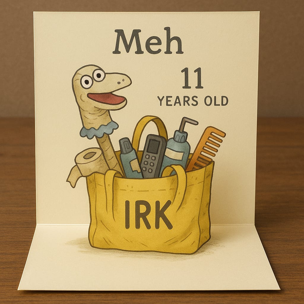 /showme a pop-up style birthday card for a weird eleven year old named “meh” where a sock puppet springs out of a reusable yellow tote bag full of random retail nonsense with IRK written on the side of the bag. it should instill a feeling of whimsical mediocrity and include the word “meh” in a nondescript font.
