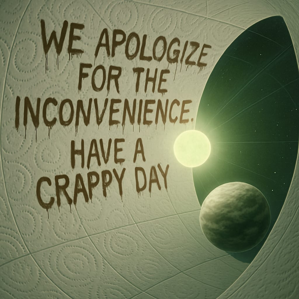 /showme a birthday card that is actually a dyson sphere surrounding a solar system with a pale green sun in the center, illuminating a single clouded planet in its orbit; an observer on that planet above the cloud cover would see plastered on the inner surface of the dyson sphere the words “We apologize for the inconvenience. Have a crappy day” in smudged and dripping brown letters on a white background that has patterning like Charmin toilet paper.