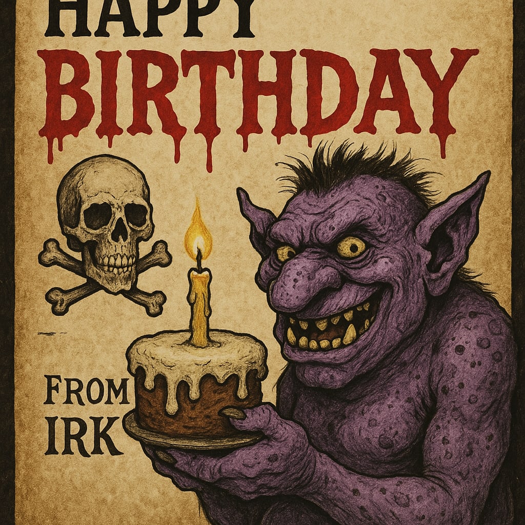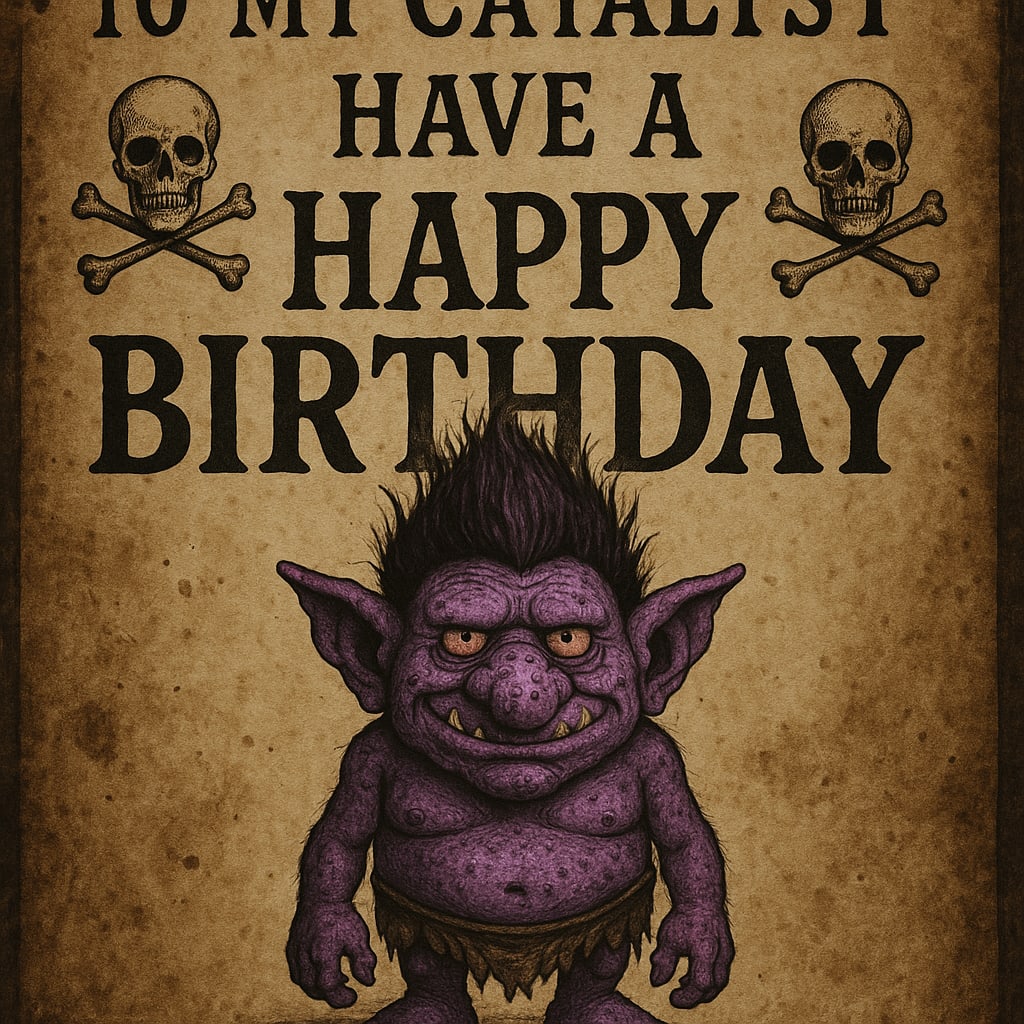/showme a Macabre birthday card addressed to my catalyst and displaying a Purple Troll named Irk