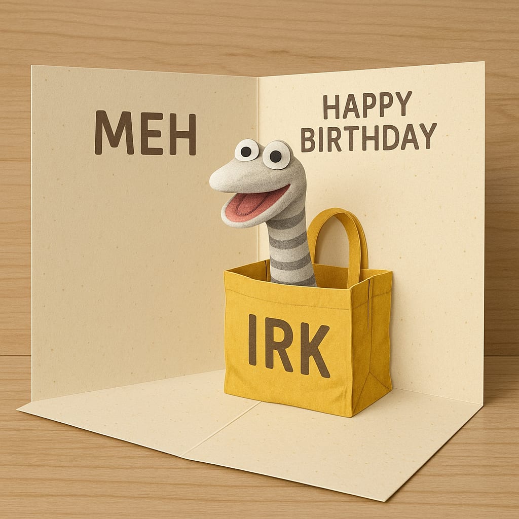 /showme a pop-up style birthday card for a weird eleven year old where a sock puppet springs out of a reusable yellow tote bag with IRK written on the side. it should instill a feeling of whimsical mediocrity and include the word “meh” in a nondescript font.