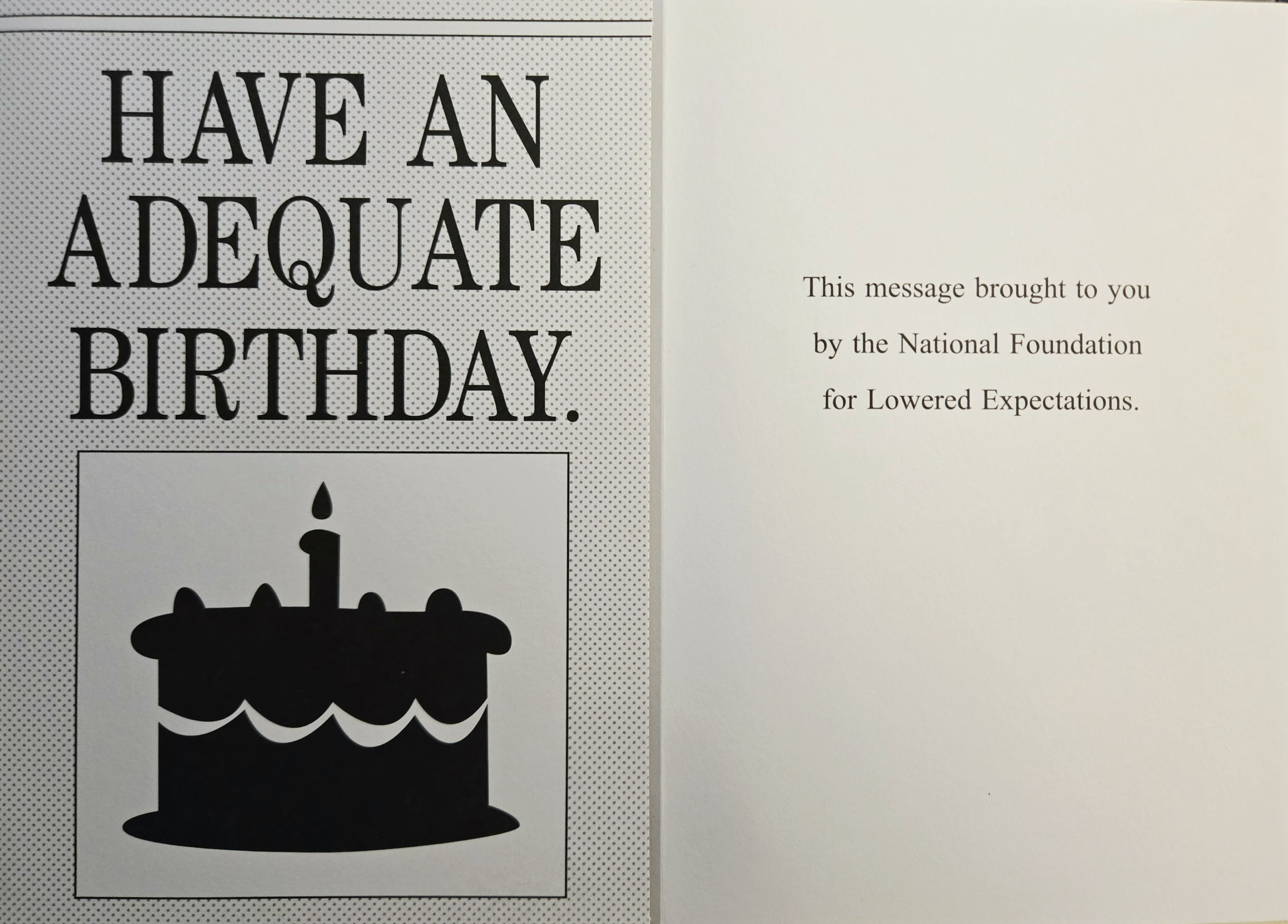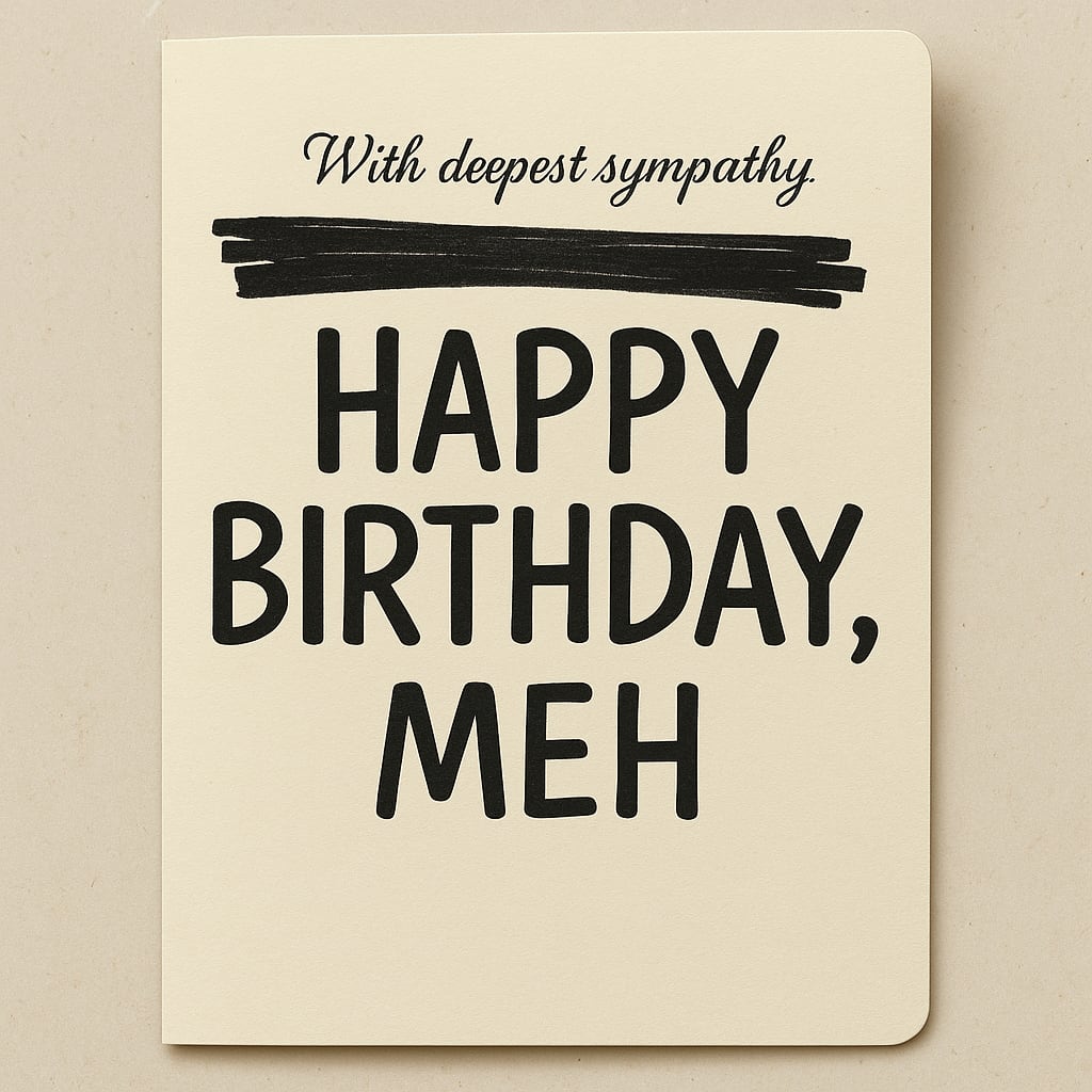 /showme a sympathy card, but the sad writing is marked out with a sharpie to make it read “happy birthday, meh”