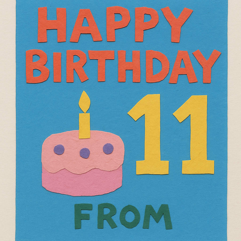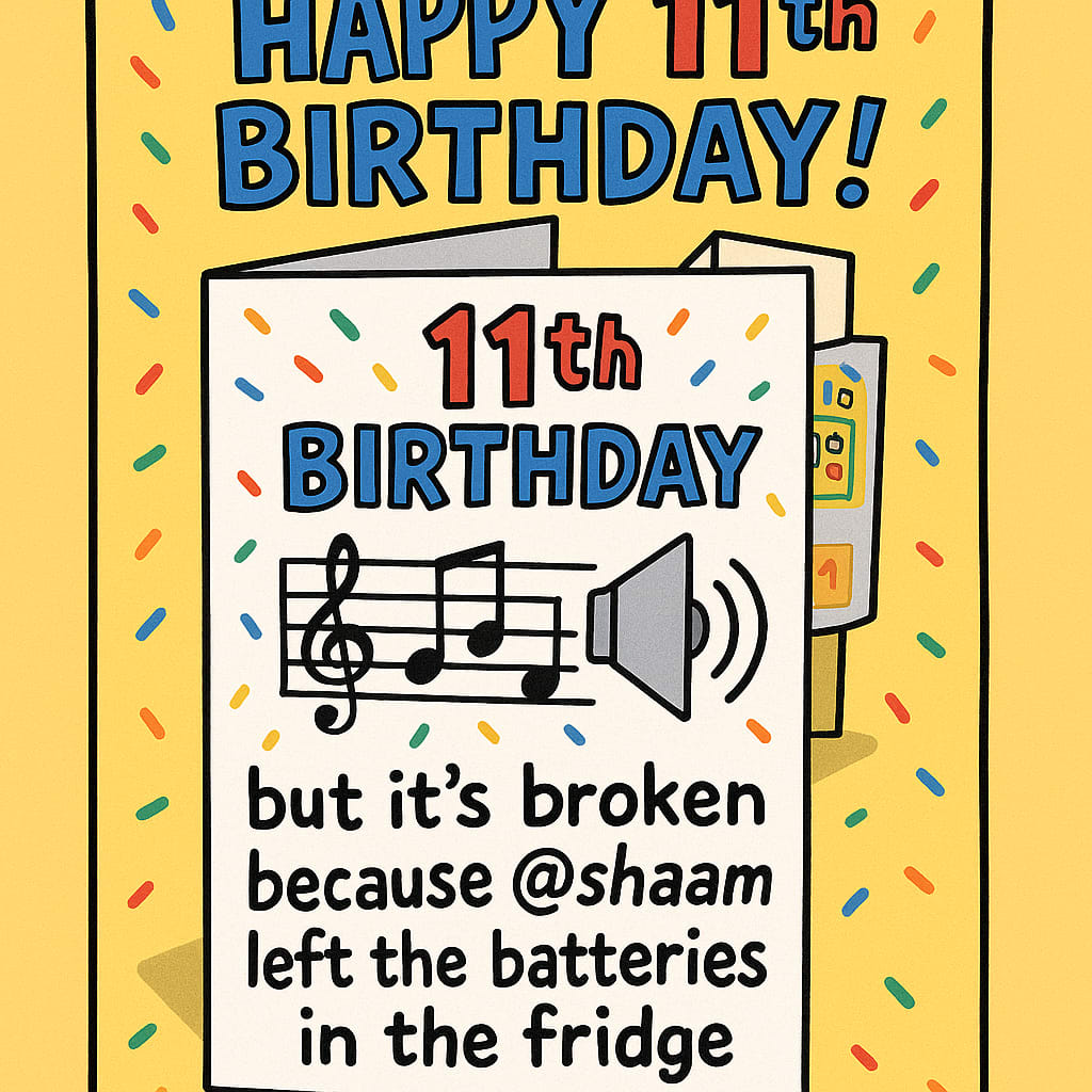 /showme an 11th Birthday card that has an 11th birthday card as the picture, and on the picture of the picture of the birthday card there is an 11th Birthday card. Make it a musical birthday card that plays Happy Birthday when you open it… but this one is broken because @shaam (sp?) left the batteries in the fridge.