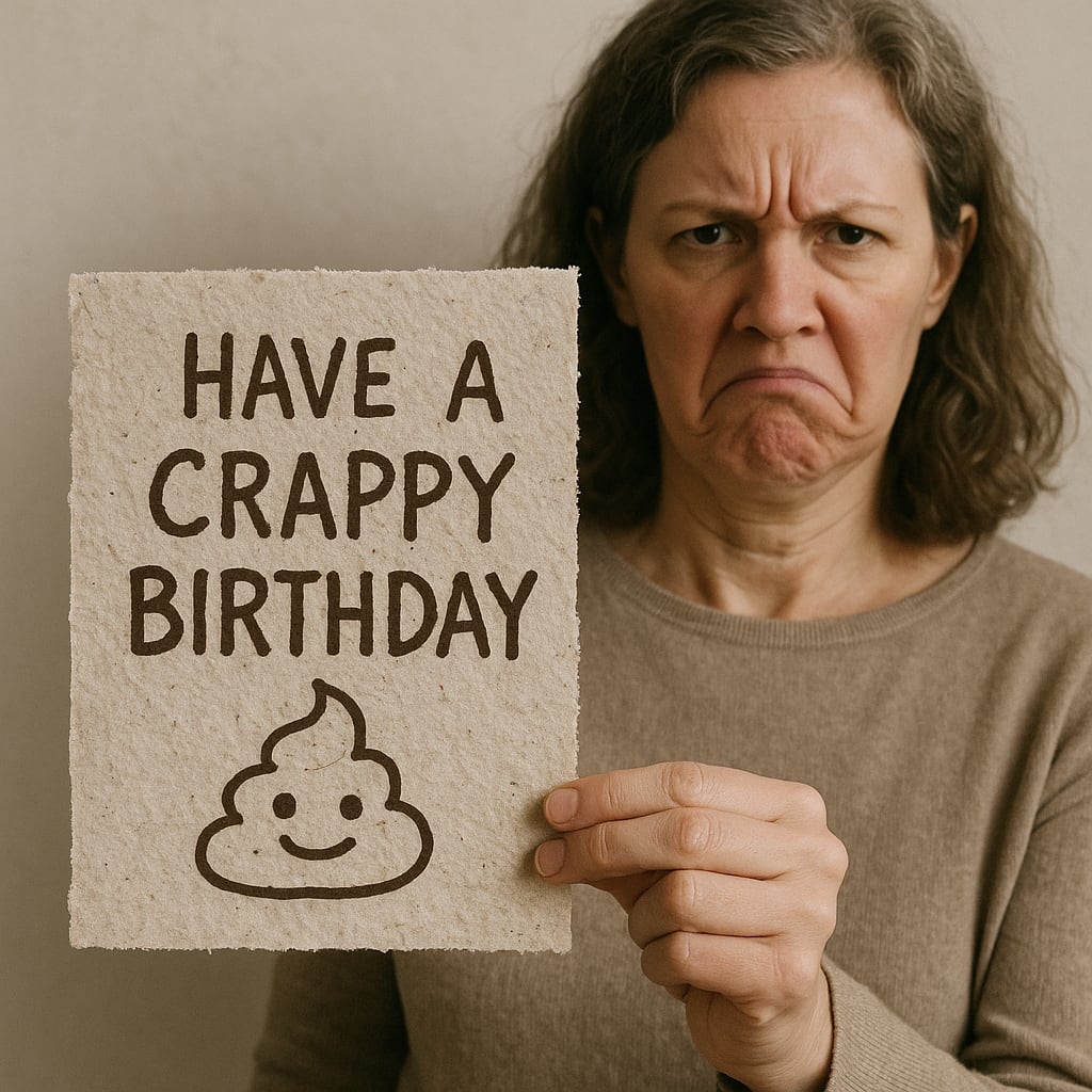 /showme a crappy birthday card made from recycled toilet paper that reads "have a crappy birthday ". The lady delivering it is disapproving