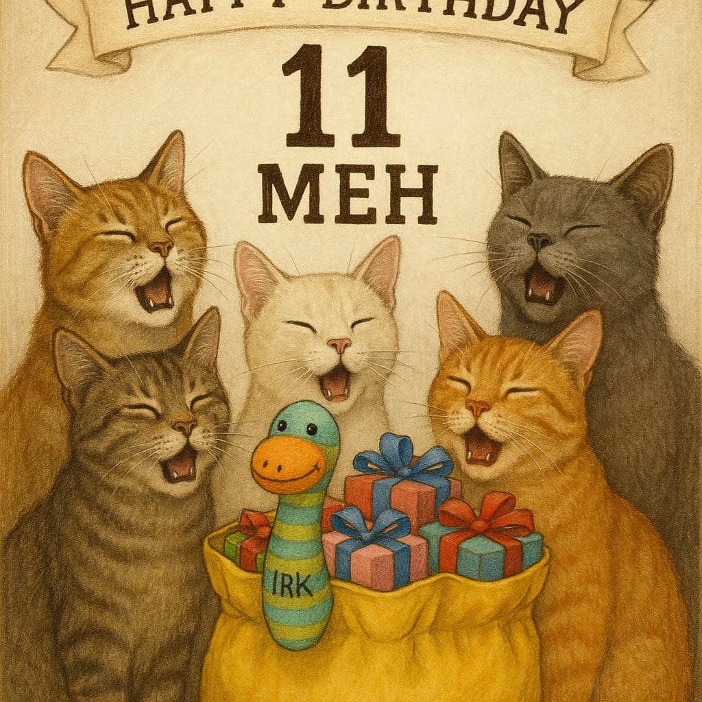 /showme a bunch of Realistic looking cats singing Happy Birthday to the 11 year old MEH, with a yellow bag having many gifts, with a striped Sock puppet named IRK.