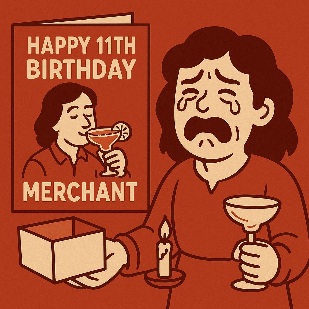 /showme a birthday card for an 11 year old merchant. Make the card Georgia Red and show someone drinking a margarita on the front. Have someone look at the card sobbing while they hold an empty present box in one hand, an empty margarita glass in another hand, and a lit candle in their third hand.