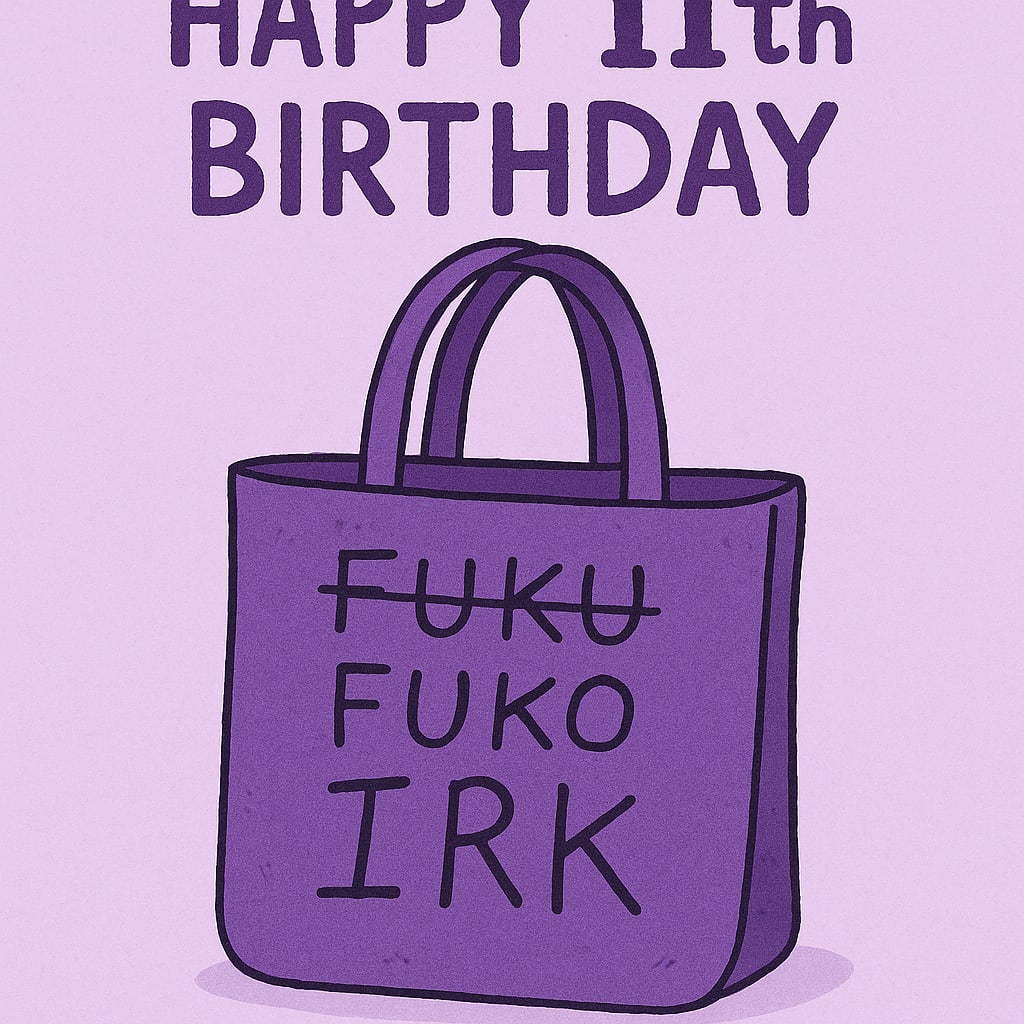 /showme an 11th birthday card featuring a purple tote bag that has the words fuku and fuko crossed out. The word irk is written on it awkwardly in childish penmanship.