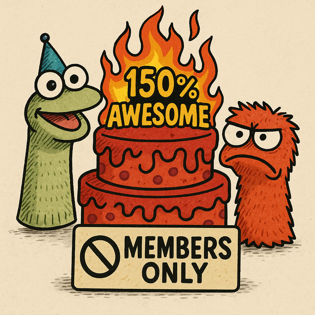 /showme a 150% awesome flaming cake that’s restricted to members only guarded by a Glenn the sock-puppet cake and and an irked irk-puppet named Irk.