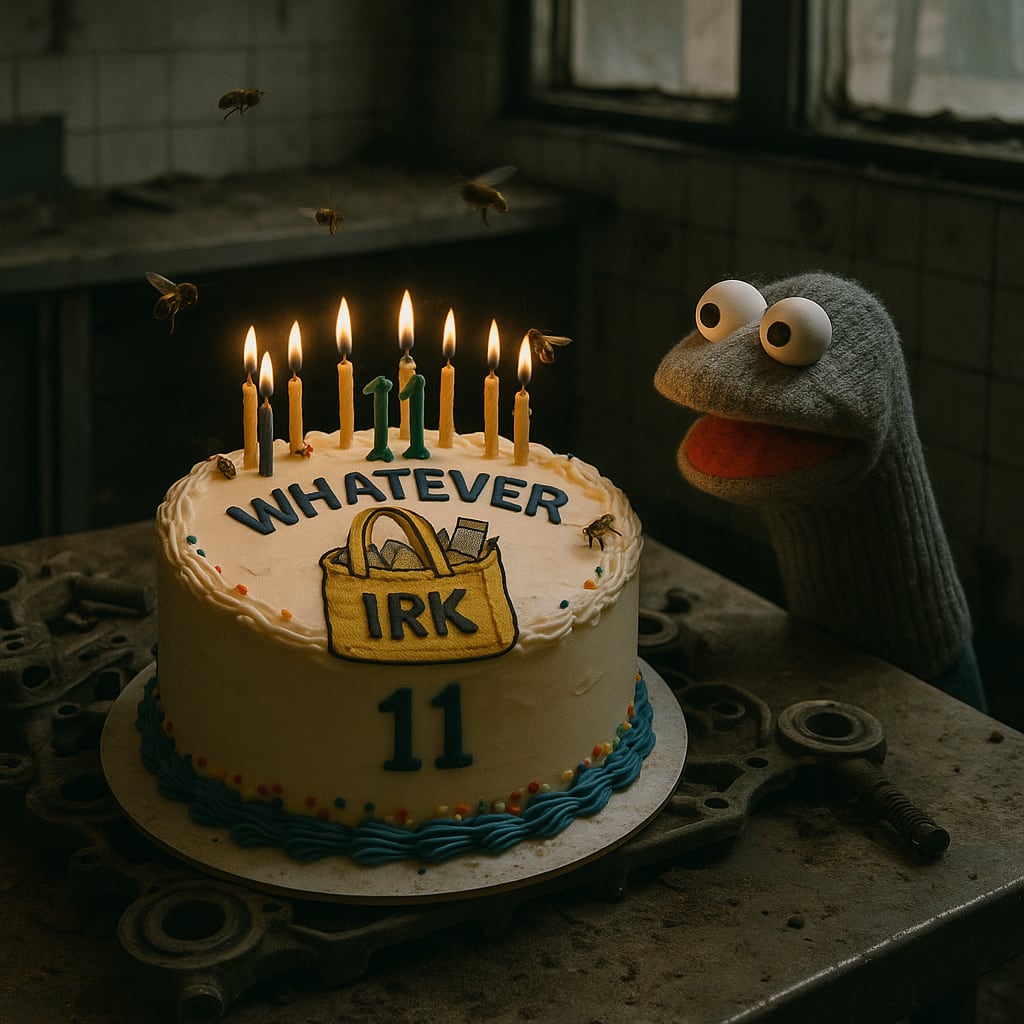 /showme a birthday cake that evokes ennui, irony, sarcasm, and low expectations, including imagery of a reusable yellow tote bag full of nonsense with “IRK” on the side, that reeks of wit and candor and low expectations, that includes hints of online retail and an unsettling undercurrent of regret. the cake should be vanilla and the image should incorporate Glenn the sock puppet, perhaps preparing to indulge. it’s for an eleven year old, but maybe one with an old soul and by the way the whole scene is taking place on a dirty table full of engine parts in an abandoned Denny’s after an underwhelming apocalypse, maybe with bees or something.