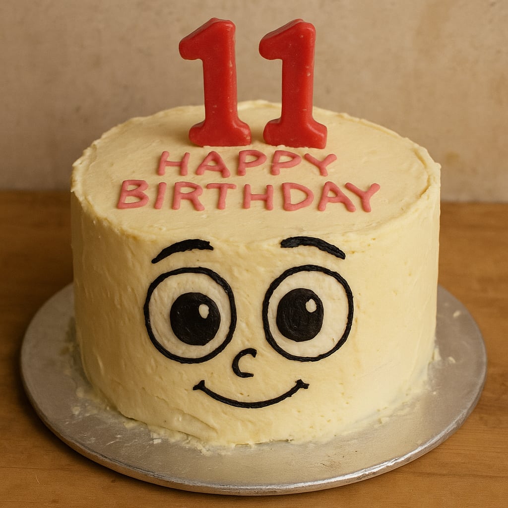 /showme a mediocre 11th birthday cake with a youthful face with very large eyes.