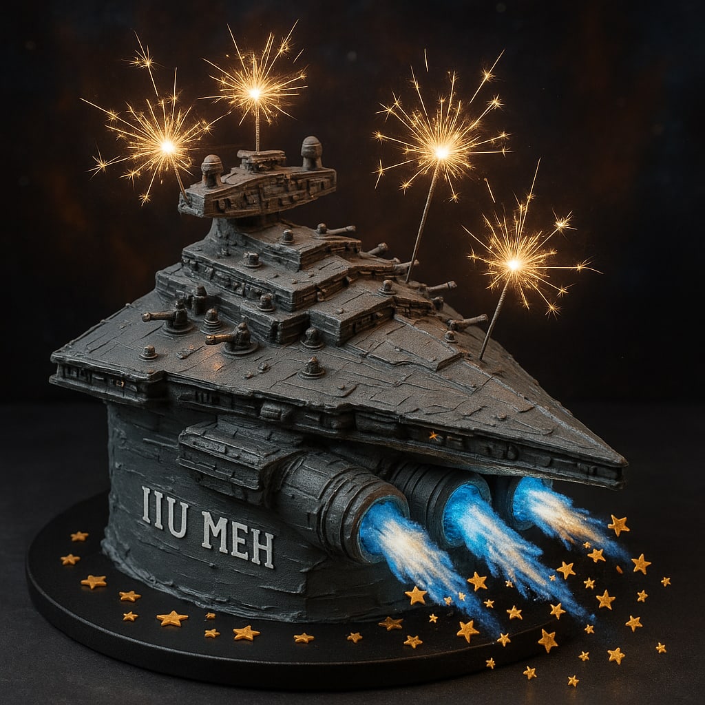 /showme an epic birthday cake in the form of an intergalactic star destroyer battleship, layered with battle-hardened frosting, many sparkler gun turrets, massive engines spewing out star shaped sprinkles, and labeled as the IIU MEH.