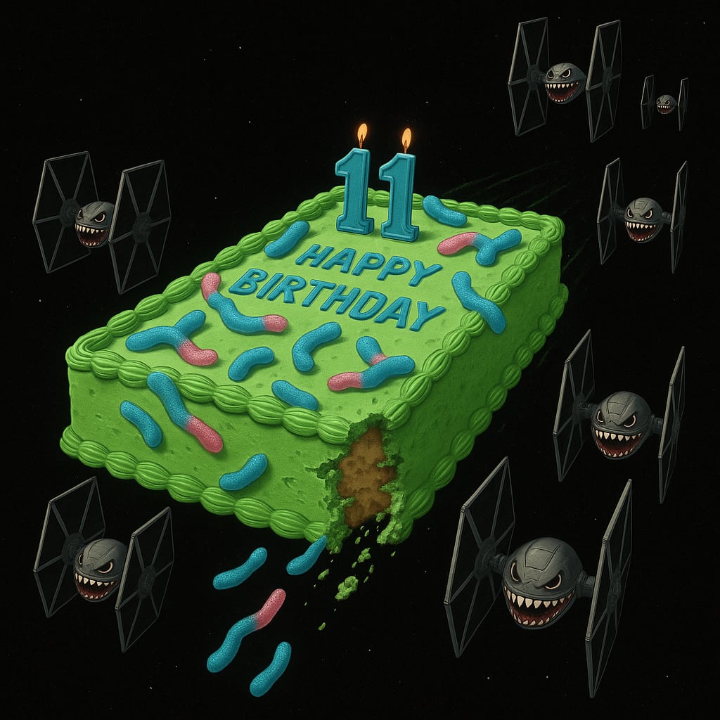 /showme a martian green 11th birthday sheet cake decorated with bright blue trolli candies that is heading away from the viewer, stretched out in an overhead perspective view, receding into the distance like the starships in the original Star Wars movie opening. One of its rear corners is damaged from enemy fire, and blue trolli candies are trailing back from it like debris. the cake is being followed by a swarm of enemy tie fighters that are between the viewer and the cake with very visible hungry jaws painted on them in the style of American world war 2 fighter planes.