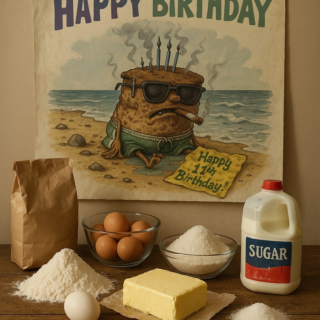 /showme a pile of cake ingredients sitting on a table, as the baker was too lazy to actually bake a cake. On the wall is a half decorated sign which says “Happy Birthday" except it’s also a bedraggled birthday cake that had to swim ashore to a rubble strewn desert island in the middle of the ocean after falling off a tramp streamer in a fit of alcoholic mediocrity. It lies now on the shore of that island, waterlogged and pitiful, its candles barely smoking because they are still wet, its swim trunks and shades crusted with sea salt, a stub of a ruined cigar hanging out the side of its mouth. It is holding a bile yellow party napkin that is printed with “Happy 11th Birthday!” in a wet iridescent green that looks like it was scrawled on by a dyspeptic slimy caterpillar except it’s also a cake that’s only available if you join membership except it’s also a meh cake flambe except also it’s a mediocre 11th birthday cake in the style of Margaret Keane