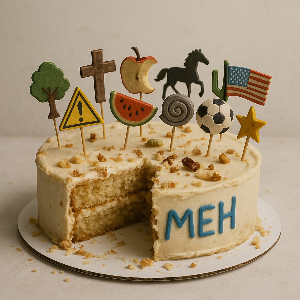/showme a birthday cake that is so meh than even meh would order a birthday cake from Costco instead of trying to use that ever so meh cake, all festooned with old debris, shredded IRK bags, returned deelybops, bedraggled party hats, sitting next to a bowl of potato salad that has been sitting out in the sun for several days because the cake is so meh that it rubbed off on the potato salad which might actually have been great potato salad if it wasn’t sitting next to that meh cake.