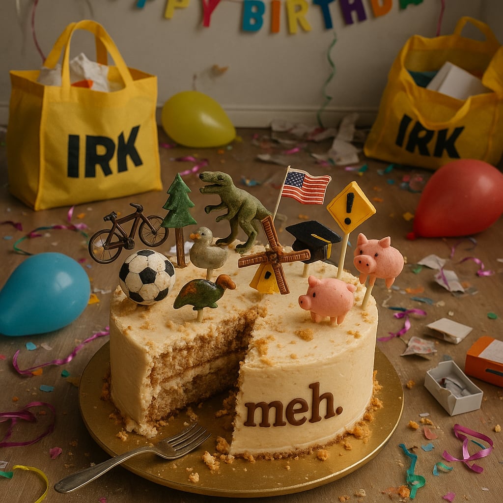 /showme @narfcake’s birthday cake that says meh on the side and is topped with eleven different cake toppers that have no relation to a birthday whatsoever except now the birthday is over and everything is half eaten and in untidy disarray, it should be placed in a setting that looks messy from a party, with half deflated balloons, bedraggled birthday decorations, and evidence of opened packages. include some battered yellow tote bags with “IRK” on the side, some empty and some filled with retail nonsense.