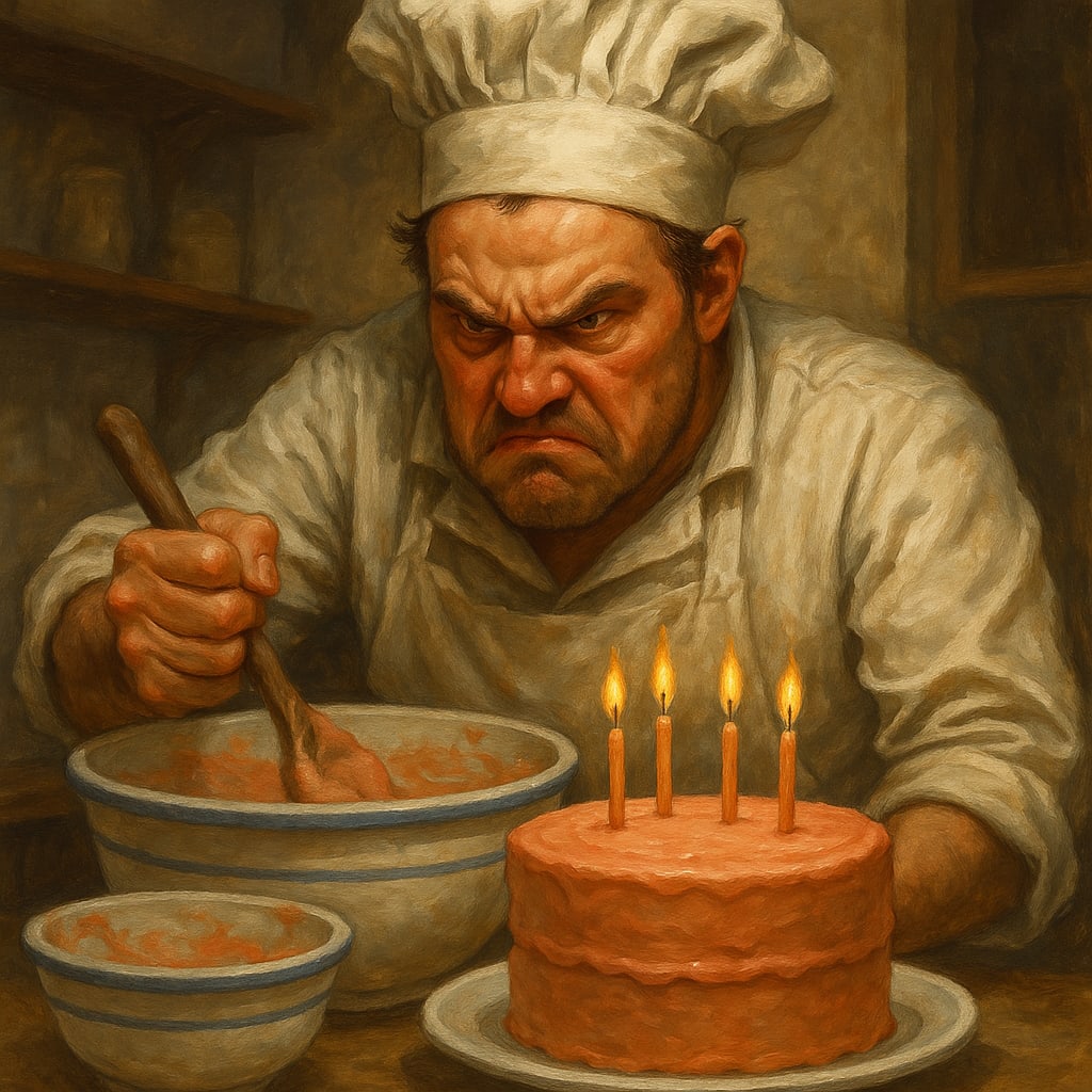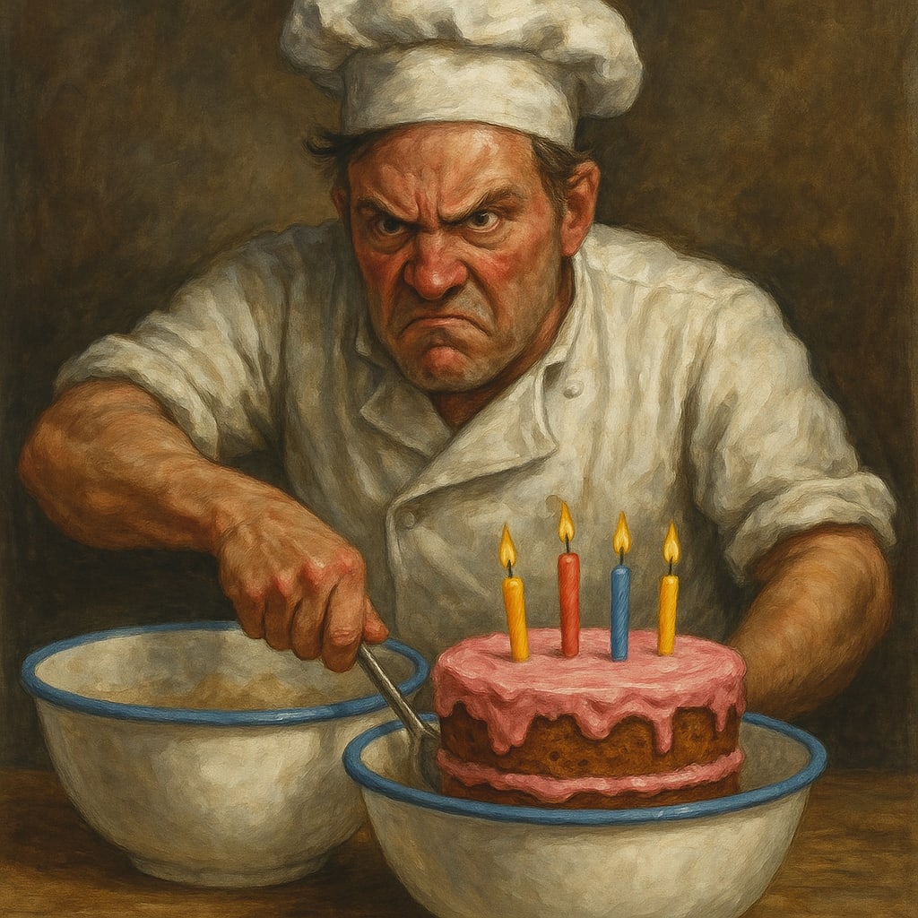 /showme A really pissed off baker making a birthday cake inside some white mixing bowls that have a cornflower blue rim.