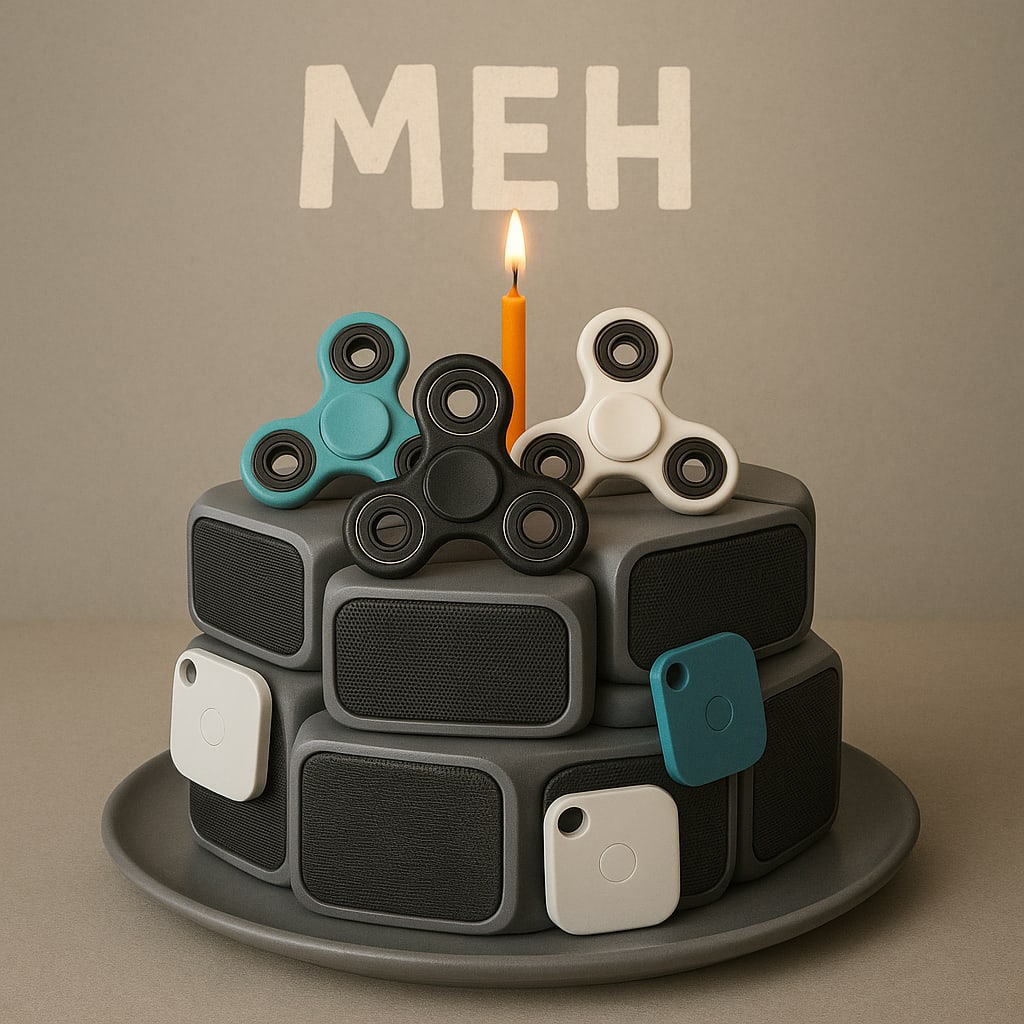 /showme a meh birthday cake made up of speaker docks, fidget spinners, and trackers.