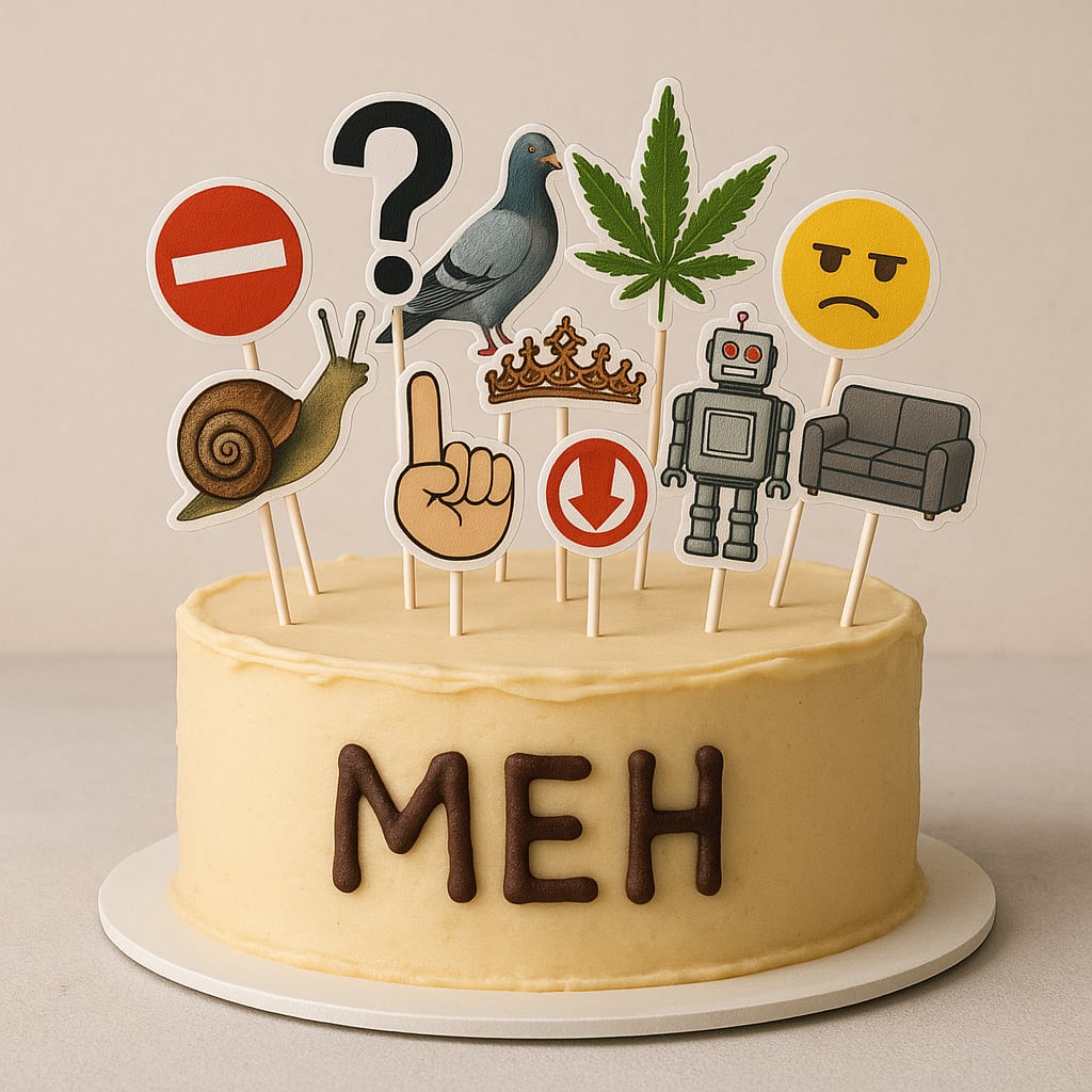 /showme a birthday cake that says meh on the side and is topped with eleven different cake toppers that have no relation to a birthday whatsoever