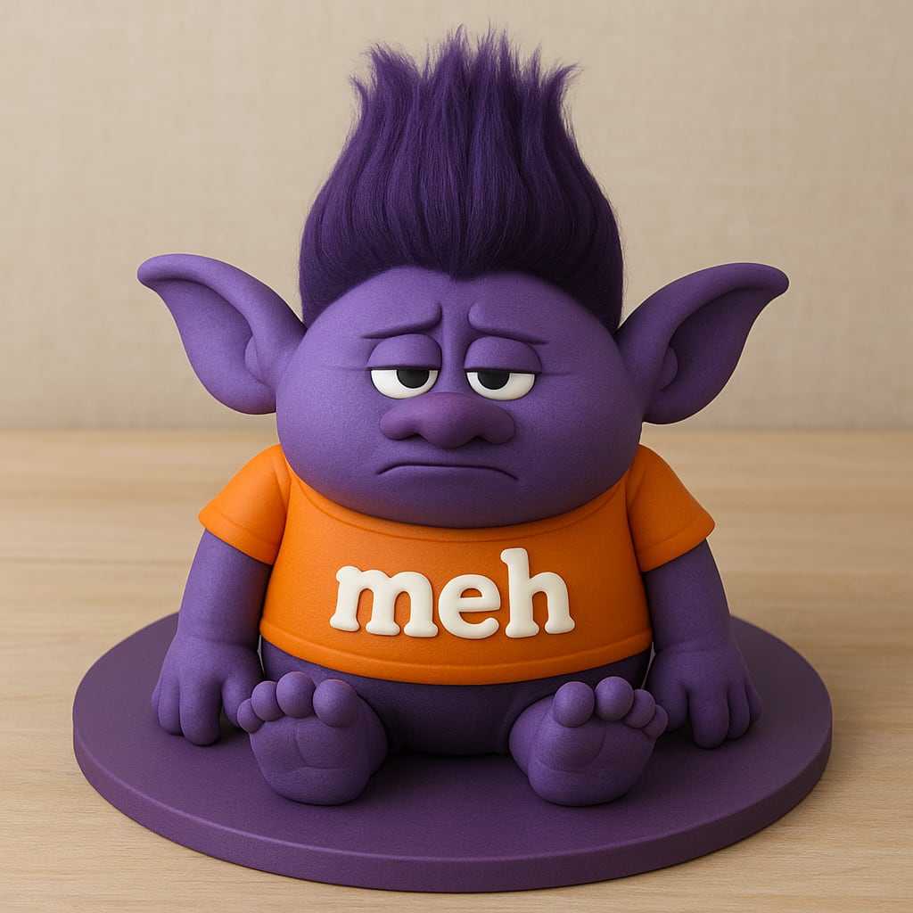 /showme a cake shaped like a purple troll wearing an orange shirt that says “meh” on it in white letters