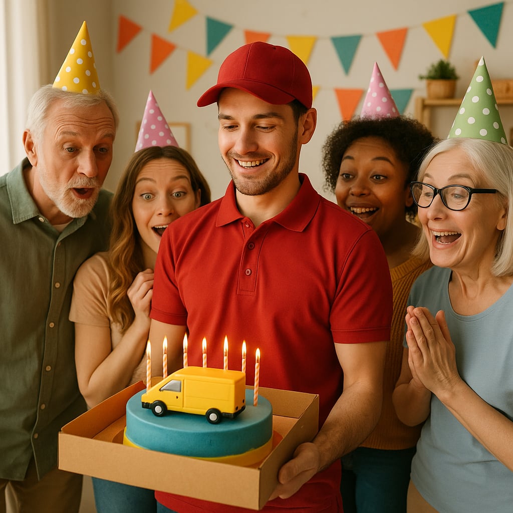 /showme birthday party members admiring the parcel delivery guy’s “cake”