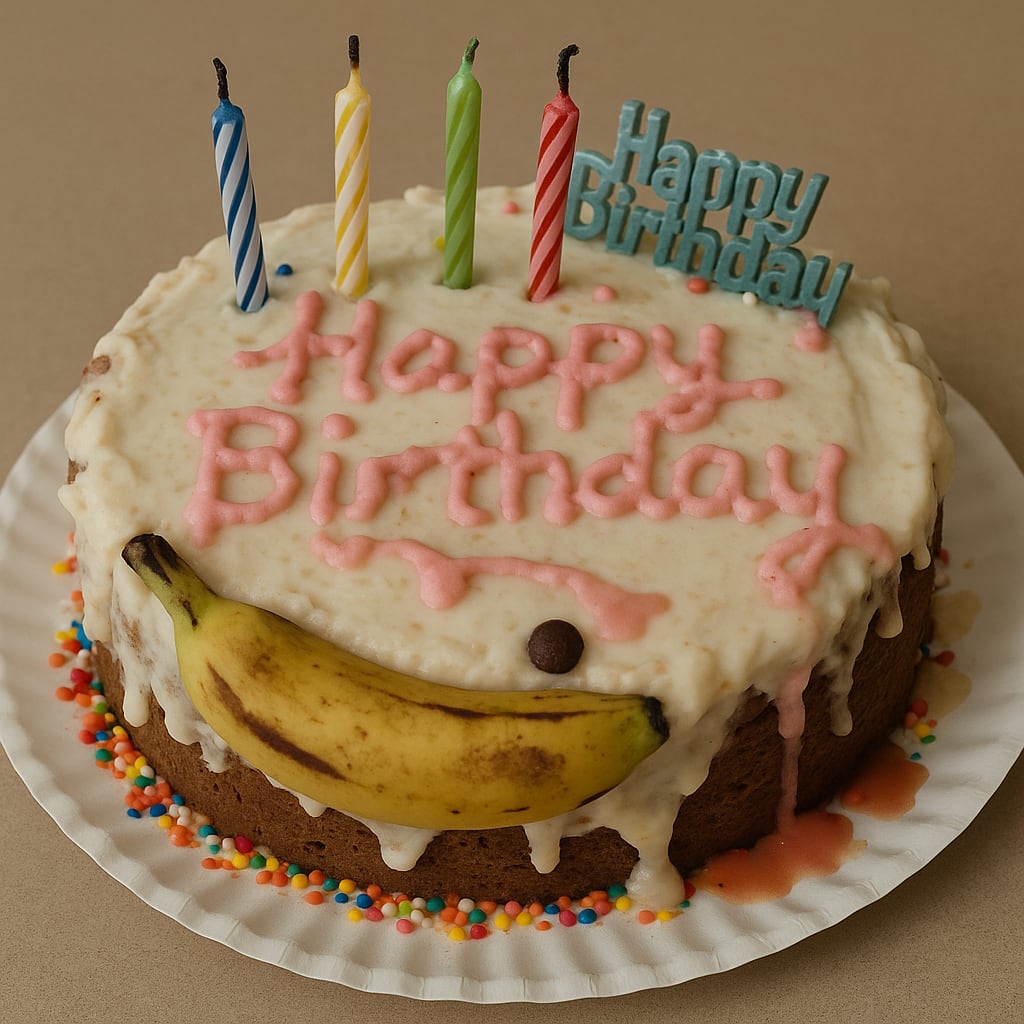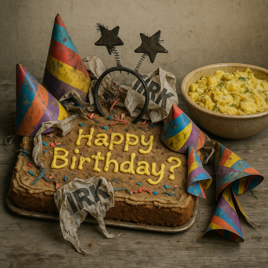 Let’s put on on our (your) prompt-engineering hats and work together to come up with the most IRKtastic, meh-appropriate, over-the-top cake design that’s even less edible than the fondant on all those baking shows.