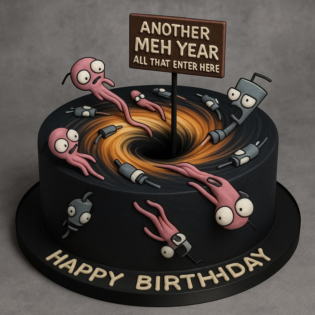 /showme a birthday cake in the form of a black hole and its event horizon, with IRKs and Fukos being sucked in elongating and swirling down into the black hole like stuff swirling down a drain. A billboard floating just outside the event horizon is labelled “Another MEH year, all that enter here”