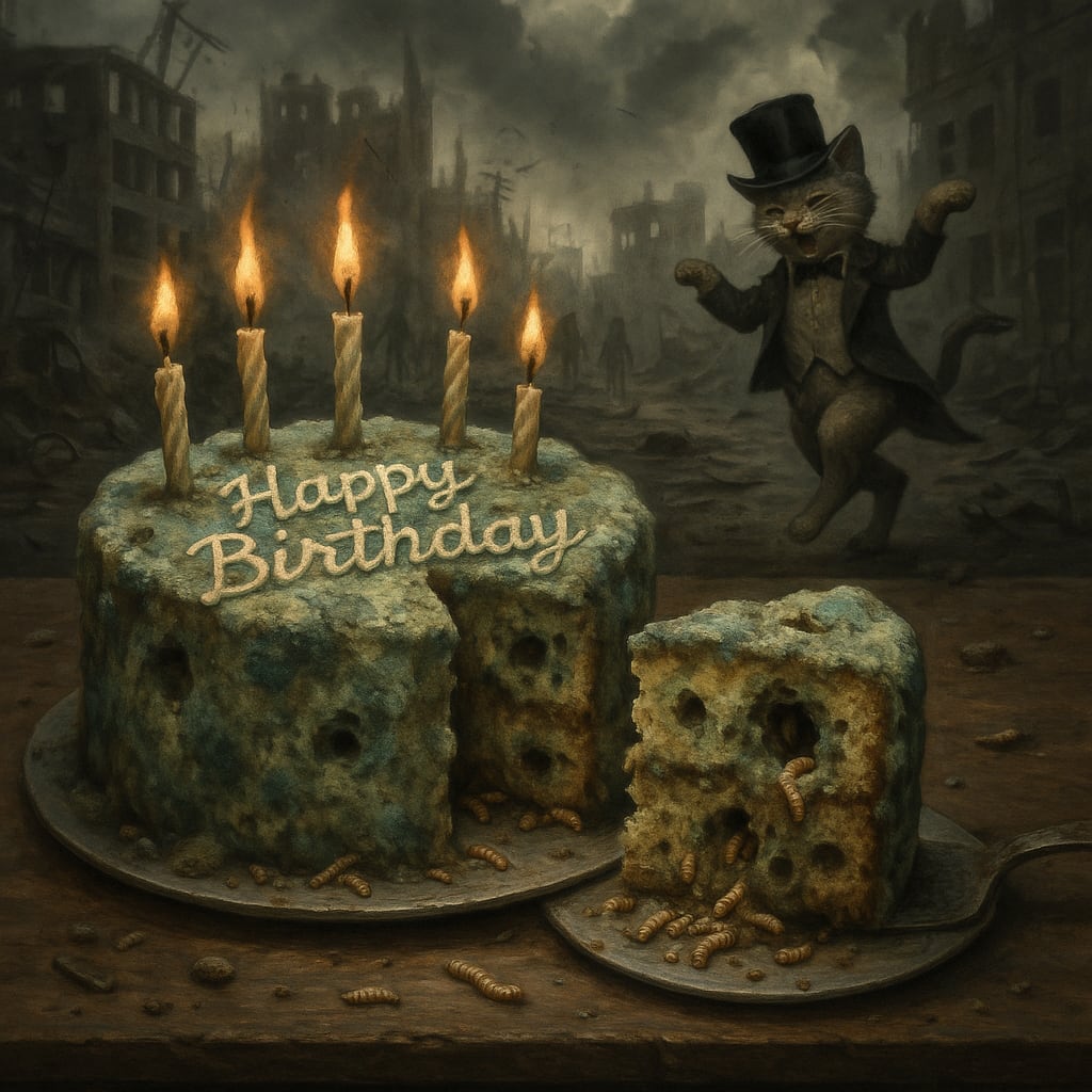 /showme a moldy birthday cake sitting on a table in the middle of the zombie apocalypse. Once slice has been cut out of it and there are maggots crawling out of holes in the interior. Oh, and put a dancing cat in top hat and tails in the background just for fun.