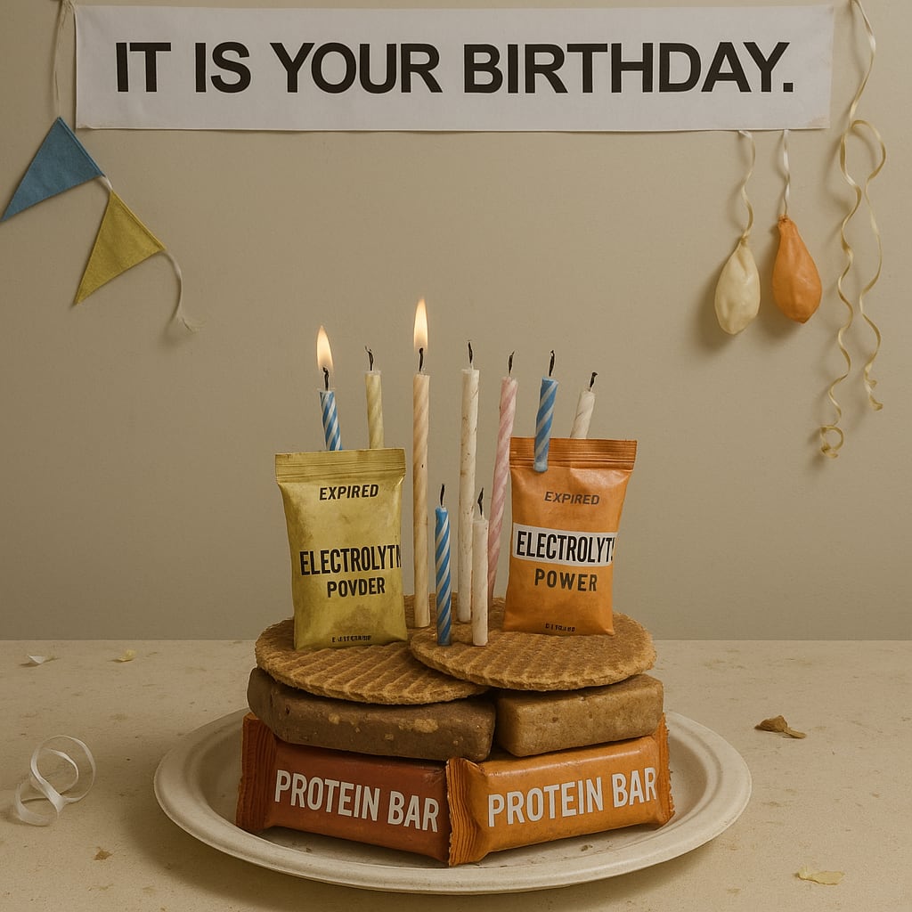 /showme a very meh birthday cake made out of snacks such as protein bars, stroopwafels, protein bars, and electrolyte powder pouches that are all nearing or past their expiration date. Top the cake with eleven partially broken candles, only three of which are lit. Place the cake on a barely decorated table festooned with the minimum of joyous decoration as well as a little bit of trash. In the background hang a banner that proclaims in all caps “IT IS YOUR BIRTHDAY.”