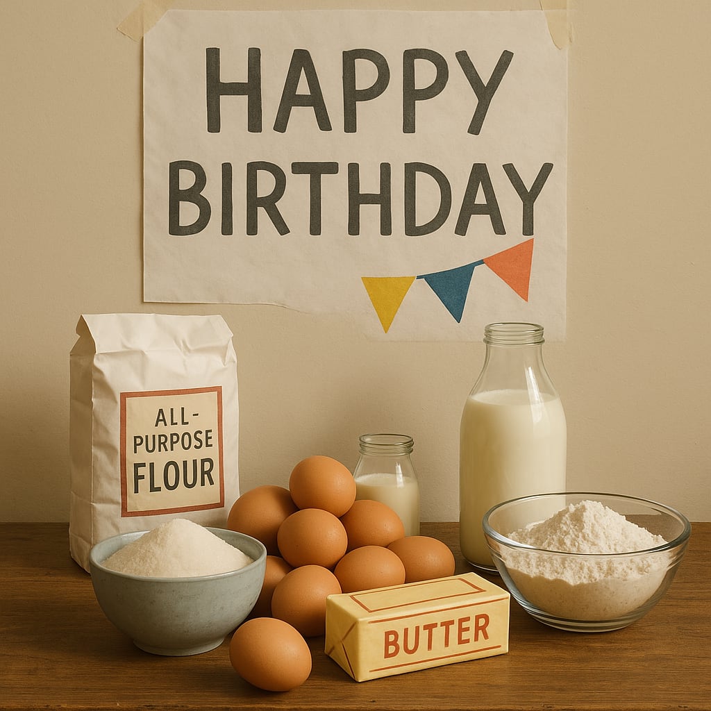 /showme a pile of cake ingredients sitting on a table, as the baker was too lazy to actually bake a cake. On the wall is a half decorated sign which says “Happy Birthday”.